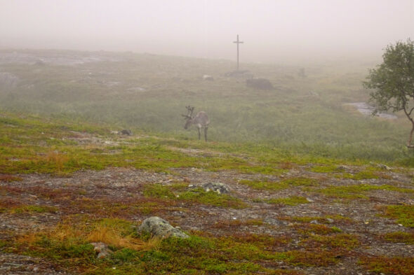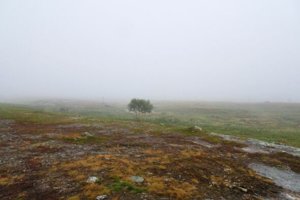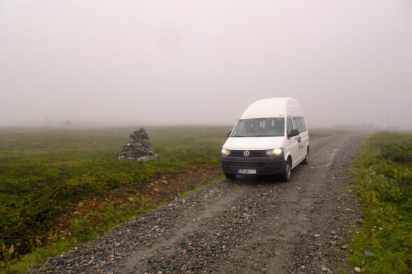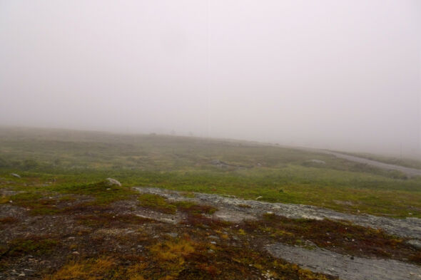 Hier, ganz in der Nähe von Alta, möchten wir eine Wanderung an den Sautso-Canyon machen, durch den der Altaelva fließt. Dieser Canyon ist annähernd 12 km lang und 300-420 m tief. Auf einem knapp 7 km langen Pfad in gut 400 m Höhe können wir über die kahle Fjell-Hochfläche an den Rand des Canyons wandern und ihn von oben bestaunen. So fahren wir auf einer Asphaltstraße in das Tal des Altaelva und dann ansteigend zur Garggia-Fjellstue. Hier beginnt eine knapp 4 km lange, steile Schotterpiste, die auf das kahle Fjell in 400 m Höhe hinauf führt. Ein kleiner Parkplatz auf blankem Fels zeigt an, dass wir das Ende der Piste erreicht haben. Wegweiser deuten nach links, zum Rand des Sautso-Canyon sind es noch 7 km. Aber leider meint es das Wetter nicht gut mit uns: Nebel, Nieselregen, Null Sicht.