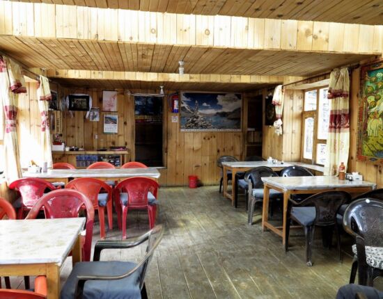 Zunächst müssen wir auf bekanntem Weg wieder durch die Landslide Area. Das Wetter ist super schön, strahlend blauer Himmel, um uns herum weiße Eisriesen. Und so gelingt der Weg mit sehr viel weniger Herzklopfen. In Shri Kharka gibt es dann zur Belohnung eine längere Pause mit verfrühtem Mittagessen.