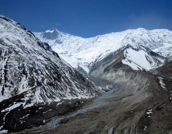 Gut gestärkt nehmen wir nun den Weg in Richtung Upper Khangsar. Unser Weg steigt leicht an, ist gut und bequem gehbar. Der Blick zurück auf die vergletscherten Gipfel ist gigantisch. Oberhalb von Upper Khangsar geht es weiter in Richtung Osten. Wir steigen weiter leicht bergauf, bis wir einen Sattel erreichen. Von hier genießen wir den tollen Blick in das weite Marsyangdi Tal. Wir steigen vom Sattel bergab und erreichen eine Brücke, die uns über den Thorung Khola bringt.
