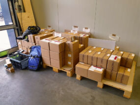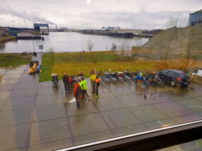 Am verregneten Ostersamstag, dem 30. März 2024, treffen wir uns alle gegen 11.00 Uhr bei den Chokolatemakers in Amsterdam, um die bestellte Schokolade abzuholen. Der Empfang ist sehr herzlich, es gibt Obst, Kuchen und warme Getränke, und es wird eine Führung durch die Fabrik organisiert. Die Schokolade ist bereits für die verschiedenen Fahrradgruppen sortiert.