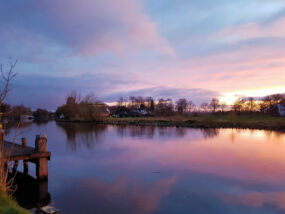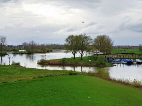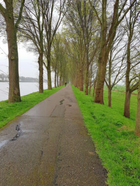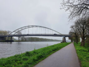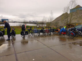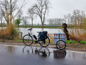 Nach der Abholung und Verladung der Schokolade geht’s zurück nach Konstanz. Die Etappe nach Maarssen ist heute nicht so lang, knapp 50 Kilometer: erst quer durch Amsterdam, dann über die typisch holländische Polderlandschaft. Und immer auf guten Radwegen, meist entlang von Kanälen. Zur Abwechslung gibt’s dann Klappbrücken oder eine Kanalüberfahrt mit einer Fahrradfähre. Trotz Regenwetter war’s eine gute erste Etappe.