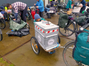 Mit dem Tourenrad können in Packtaschen ca. 8 Kilogramm, mit dem Anhänger ca. 15 Kilogramm, mit dem Liegerad ca. 25 Kilogramm und mit dem E-Bike plus Anhänger auch mal 40 Kilogramm transportiert werden.