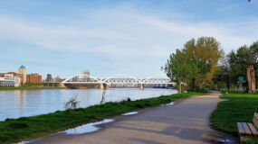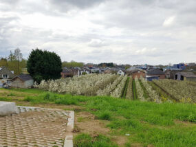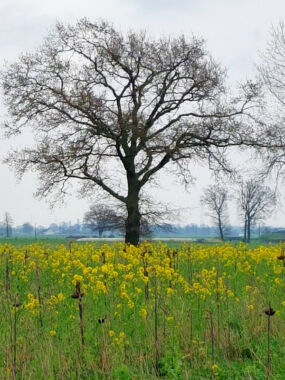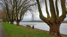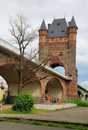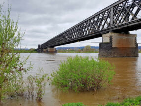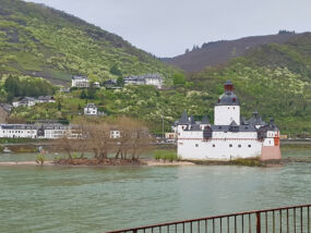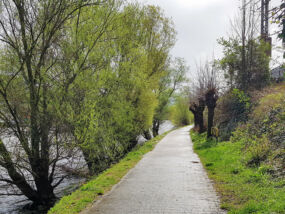 Von Boppard aus fahre ich durch das enge Rheintal, vorbei am Binger Mäuseturm. Die ersten 30 km sind entlang der Bundesstraße, das Regenwetter hat den Vorteil von wenig Verkehr, das ist richtig gut bei engen Radwegen. Vor Mainz weitet sich das Rheintal und nun kann ich die herrlichen Obstplantagen in den Rheinauen bewundern.
