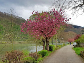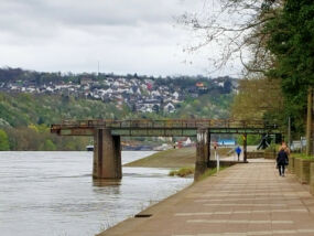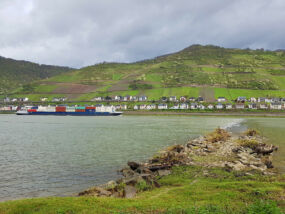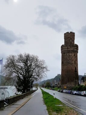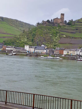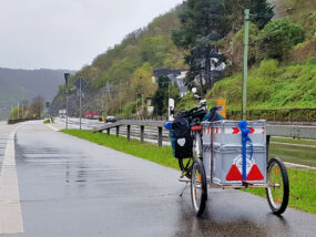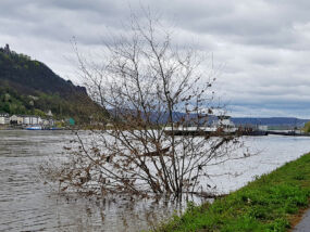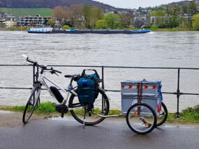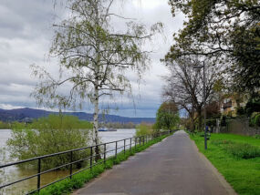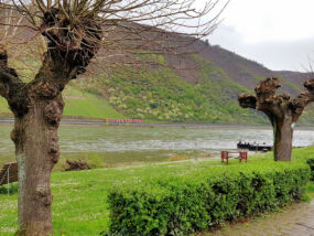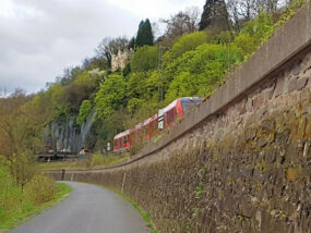 Die nächsten Etappen verlaufen auf dem Rheinradweg, immer in Sichtweite des Rheins, heute nach Boppard. Das Rheintal ist eng, so muss die Bahnlinie öfters gequert werden, eine gewisse Herausforderung. Vier Bahnunterführungen, zwei ganz gut, eine schlecht einsehbar und steil, eine mit steilem Zickzack-Weg und engen Kurven, nicht ideal für eine Fahrt mit Anhänger.