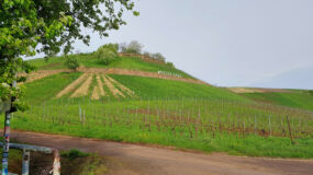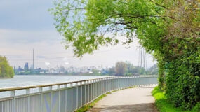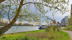 Zu Beginn bestimmen heute Weinberge das Landschaftsbild. Dann komme ich zum Industriezentrum Ludwigshafen-Mannheim. Umleitung auf das andere Rheinufer und wieder zurück mit Fähren. Hier gibt es viele große Fabriken mit hohen Kaminschloten, die BASF-Gebäude sind sehr beeindruckend.