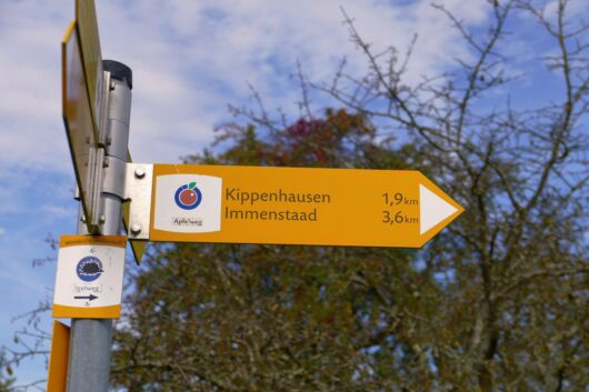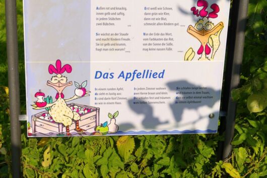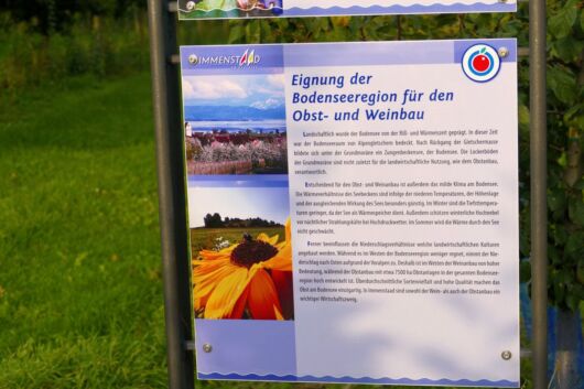 Der Immenstaader Apfel- und Weinspazierweg ist ein nicht allzu langer Spazierweg am nördlichen Bodensee-Ufer. Auf 27 Tafeln erfahren wir dabei interessante Themen und Informationen rund um den Obst- und Weinanbau am Bodensee. Entlang des Weges bieten zahlreiche Hofverkäufe nicht nur hervorragenden Wein und frisches Obst, sondern auch edle Destillate und Liköre an.