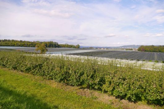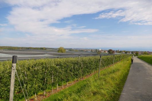 Durch viele Apfelplantagen wandern wir weiter, immer mit schönen Ausblicken über den Bodensee bis hin zu den Alpen, und erreichen auch schon bald wieder Frenkenbach.