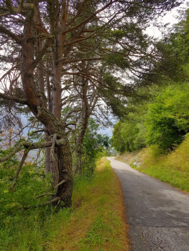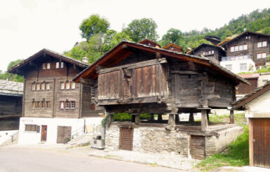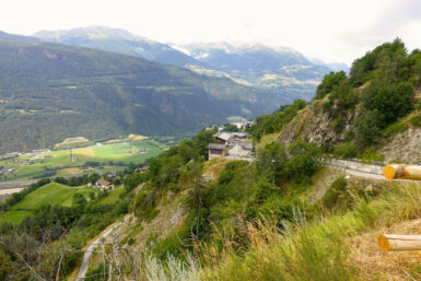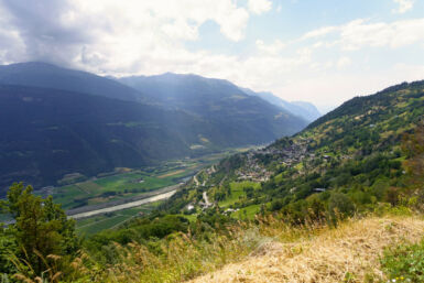 Vor der Kirche von Ausserberg können wir unser Auto abstellen. Hier folgen wir dem Wegweiser Richtung «Stolleneingang», verlassen die typischen Oberwalliser Holzhäuser und steigen auf einem Strässchen stetig an.