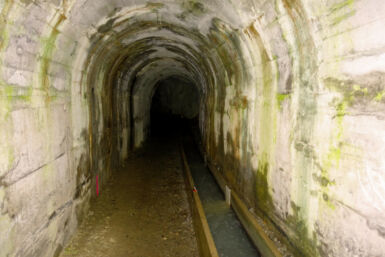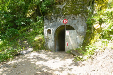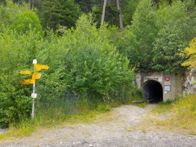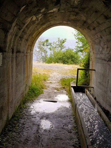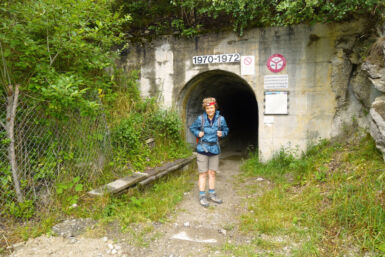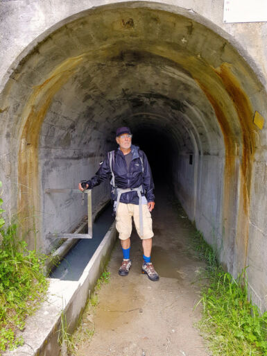 Der Stollen dient der sicheren Wasserversorgung von Ausserberg. Er wird aber auch als Wanderweg genutzt, ist aber nicht beleuchtet und so ist es im Stollen stockdunkel (Taschen- oder Stirnlampe mitnehmen!). Der Stollen ist ca. 1,6 km lang, so dass wir nach ca. 20 Minuten das andere Ende erreichen.