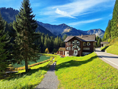 Rund um das Freschenhaus (1.846 m) und den Hohen Freschen (2.005 m) im Bregenzerwald liegt das größte Naturschutzgebiet Vorarlbergs. Die Hütte thront aussichtsreich über dem Rheintal und ist ein beliebtes Ziel für Wanderer, Mountainbiker und im Winter auch für Schneeschuhwanderer. Unweit der Hütte befinden sich die die gepflegte kleine Freschenkapelle. die über 700 m lange Freschenhöhle sowie ein Steingarten, der neben Alpenpflanzen auch Flora aus anderen hochalpinen Regionen der Welt zeigt. Mehrere Wege führen zum Freschenhaus, ich entscheide mich heute für den steilen Aufstieg von Bad Laterns.