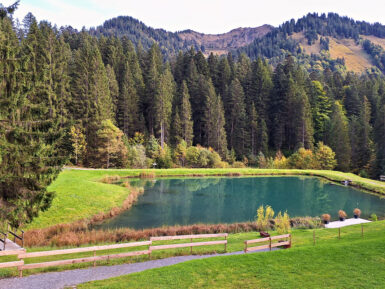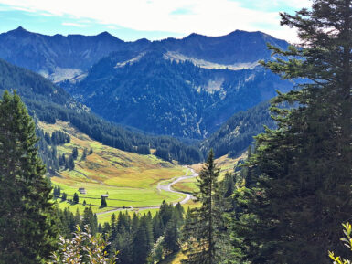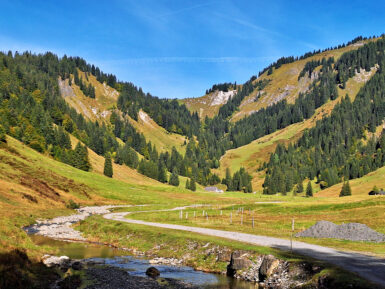 3. Oktober – ein sonniger, herrlicher Feiertag. Vom Gasthaus Bädle in Bad Laterns (1.147 m) folge ich zunächst ein kurzes Stück der Furkajochstraße, bis ich auf Höhe eines Parkplatzes links auf den markierten Wanderweg abbiege, der zum Freschenhaus und weiter zum Hohen Freschen führt. Der Weg verläuft entlang des Garnitzabaches, zunächst durch schattigen Wald, dann über freie Flächen bis zur Vorderen und Hinteren Garnitzaalpe (1.272 m).