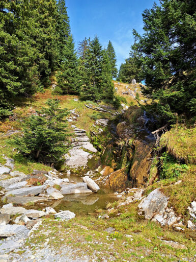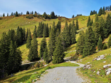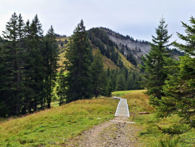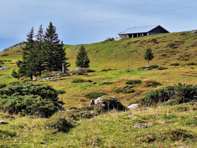 Hier geht der Fahrweg in einen Steig über, der nun deutlich an Höhe gewinnt. Oberhalb des Baches und unterhalb einiger Felsabbrüche überwinde ich eine Steilstufe, teils über Steintreppen, und erreiche die Untere Saluveralpe (1.565 m).