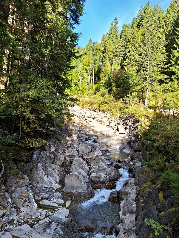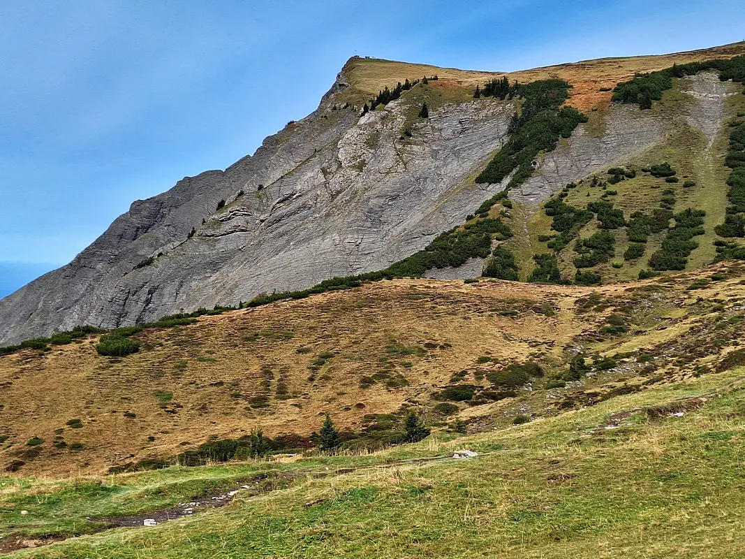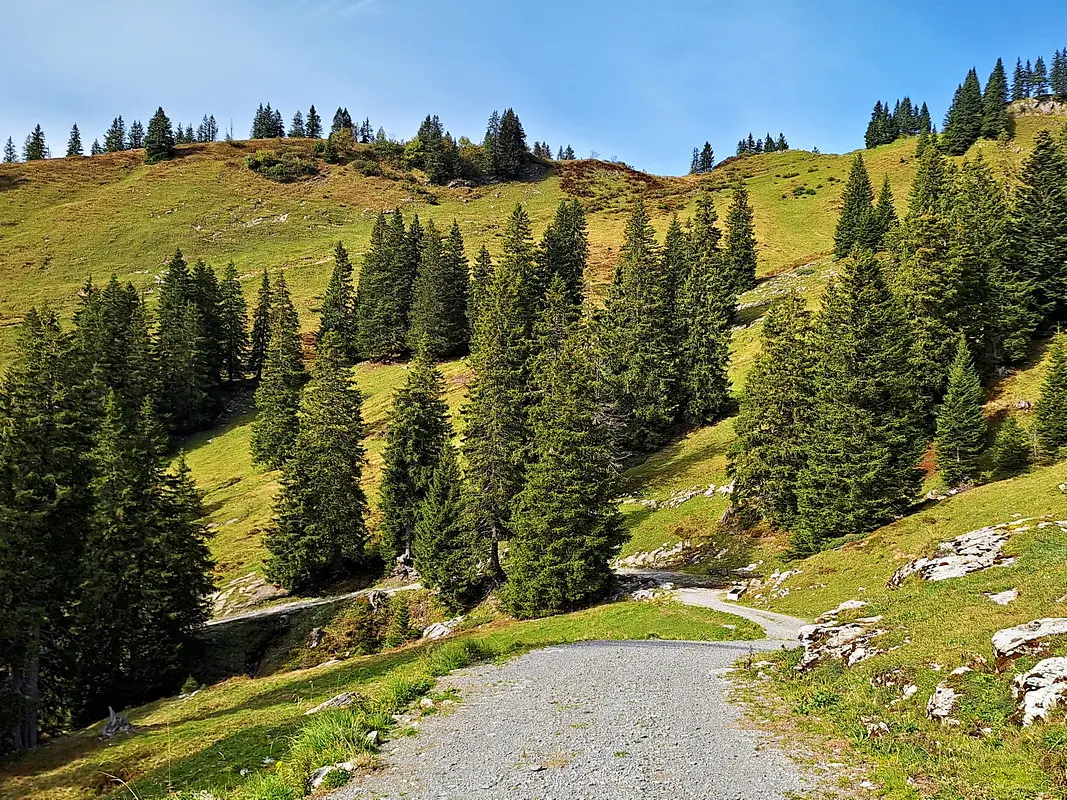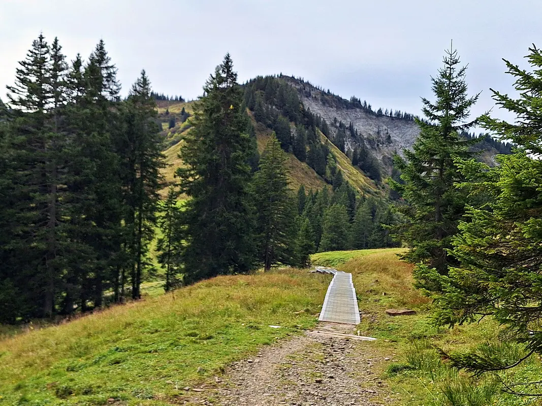 3. Oktober – ein sonniger, herrlicher Feiertag. Vom Gasthaus Bädle in Bad Laterns (1.147 m) folge ich zunächst ein kurzes Stück der Furkajochstraße, bis ich auf Höhe eines Parkplatzes links auf den markierten Wanderweg abbiege, der zum Freschenhaus und weiter zum Hohen Freschen führt. Der Weg verläuft entlang des Garnitzabaches, zunächst durch schattigen Wald, dann über freie Flächen bis zur Vorderen und Hinteren Garnitzaalpe (1.272 m).