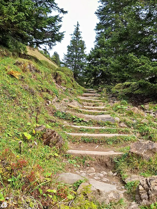 Hier geht der Fahrweg in einen Steig über, der nun deutlich an Höhe gewinnt. Oberhalb des Baches und unterhalb einiger Felsabbrüche überwinde ich eine Steilstufe, teils über Steintreppen, und erreiche die Untere Saluveralpe (1.565 m).