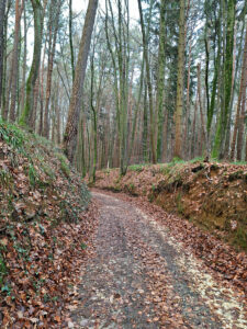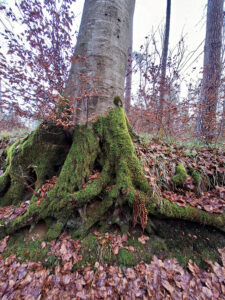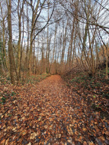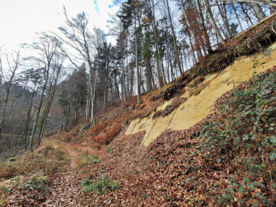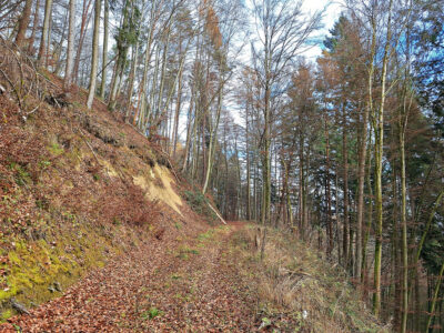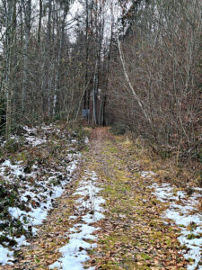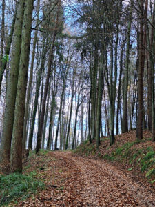 Meine Wanderung beginne ich an der Kirche in Bankholzen. Da der Weg entlang des Bankholzer Dorfbachs gesperrt ist, nehme ich einen kleinen Umweg und folge bald dem Firstweg bergauf. Vorbei am Löchle führt der Pfad bis zur Ewigkeit – ein ruhiger Abschnitt zwischen den Wäldern Ewigkeit und Steinhalde. Und tatsächlich liegen hier auch noch die letzten Spuren vonn Schnee.