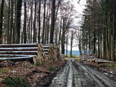 Die meiste Zeit wandere ich über Natur- und Forstwege, nur ein kurzes Stück verläuft über eine Schotterpiste, bis ich den Aussichtspunkt Ferdinandslust erreiche. Hier liegt der höchste Punkt der Tour. Auf den Bänken am Wegesrand mache ich eine kleine Rast und genieße den weiten Blick zu den schneebedeckten Alpen – ein perfekter Moment, um die Ruhe der Natur zu spüren.