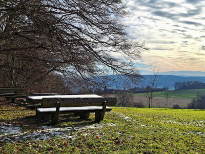 In den letzten Tagen hat es in den Alpen kräftig geschneit, auf dem Feldberg sollen inzwischen rund 70 Zentimeter liegen. Am Bodensee zeigt sich das Wetter hingegen meist nebelgrau, nur manchmal reißt der Himmel am Nachmittag auf. Genau dann ist die perfekte Gelegenheit für einen Ausflug in die Nähe. Ich entscheide mich, auf die Höri zu fahren, nach Bankholzen, für einen Rundweg auf den Schienerberg.