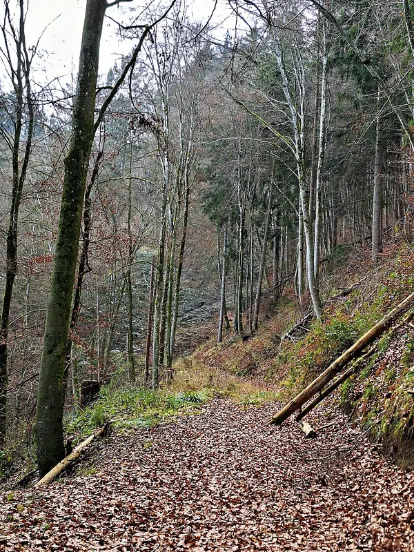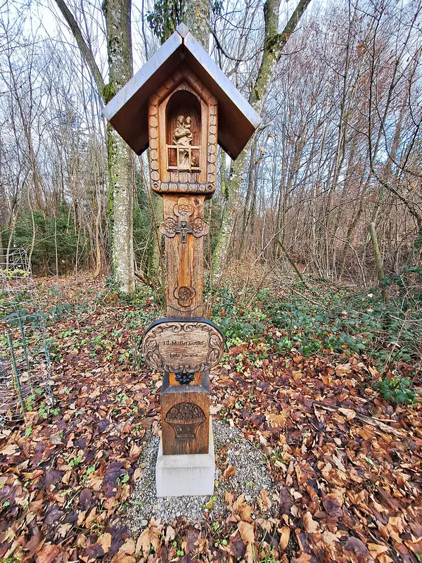 Meine Wanderung beginne ich an der Kirche in Bankholzen. Da der Weg entlang des Bankholzer Dorfbachs gesperrt ist, nehme ich einen kleinen Umweg und folge bald dem Firstweg bergauf. Vorbei am Löchle führt der Pfad bis zur Ewigkeit – ein ruhiger Abschnitt zwischen den Wäldern Ewigkeit und Steinhalde. Und tatsächlich liegen hier auch noch die letzten Spuren vonn Schnee.