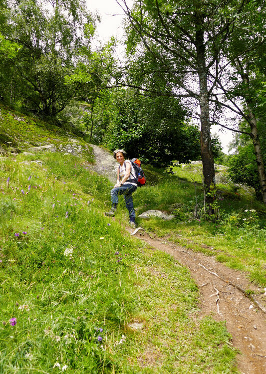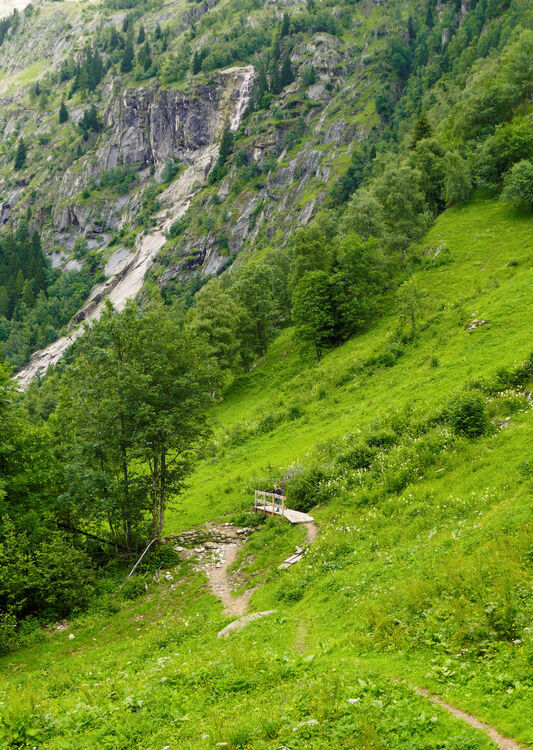 Nach dem Überqueren der Brücke beginnt der anstrengende Teil unserer Wanderung. Ein schmaler und steiler Pfad führt schön angelegt durch Felsstufen und über Alpweiden hinauf Richtung Hängebrücke. Die Ausblicke über das Goms sind fantastisch. Das letzte Wegstück ist breit und fast eben und führt direkt zur Brücke.