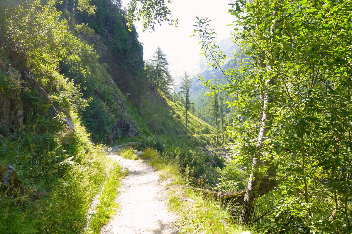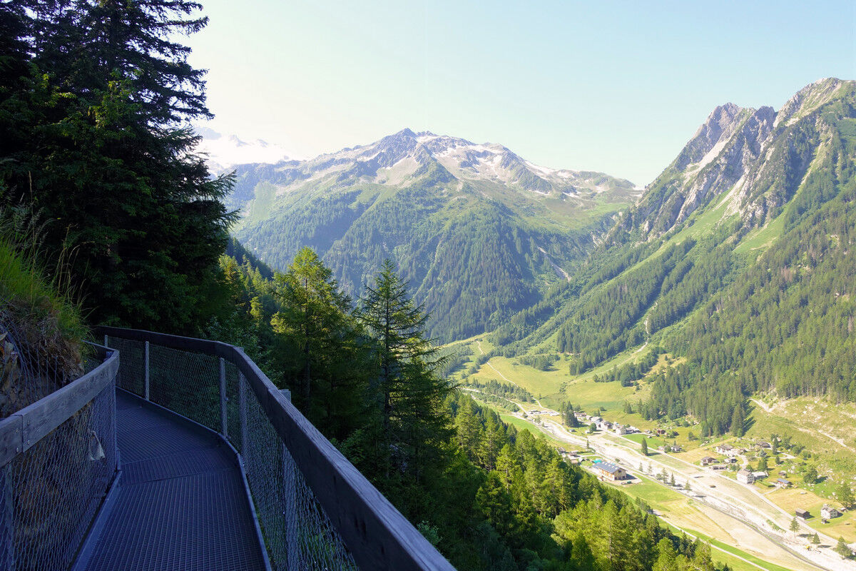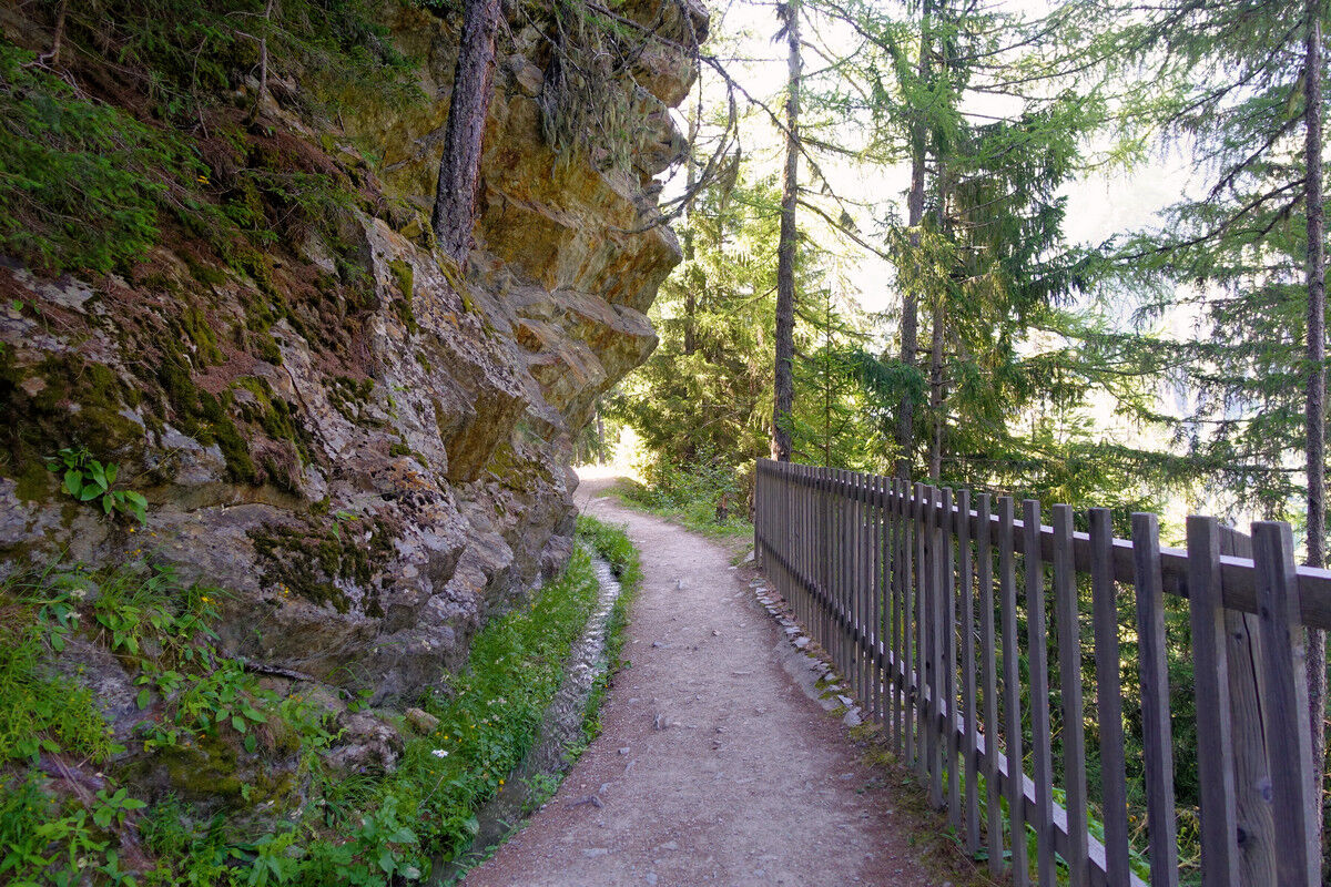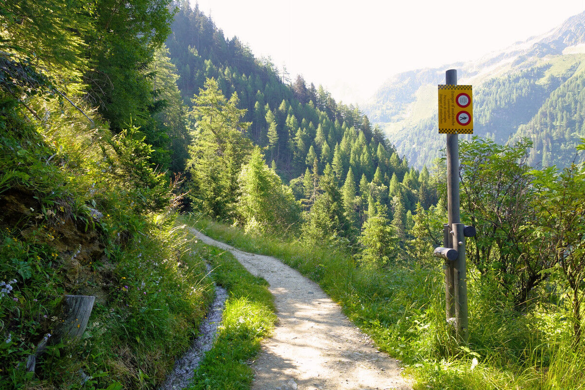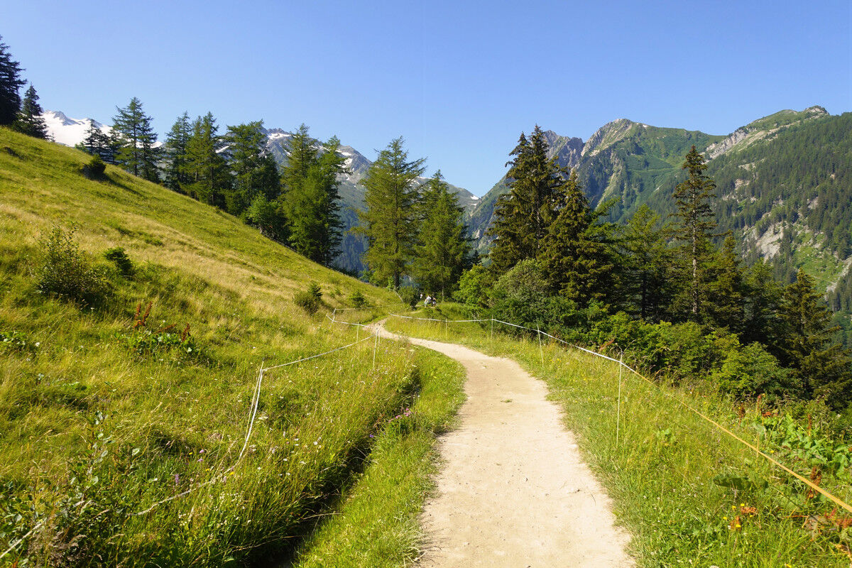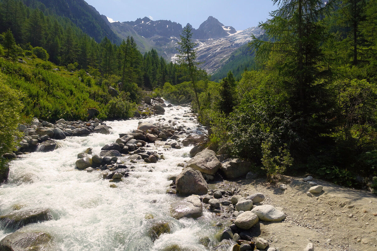 Das Schmelzwasser des Glacier du Trient speist die Bisse de Trient, die westlichste Bisse (Suone) des Wallis. Der Weg entlang der offenen Wasserleitung ist eine wunderschöne, sichere und mühelose Wanderung im Schatten der Lärchen. Links des Weges plätschert das Wasser in den offenen Holzkanälen und rechts eröffnen sich schöne Tiefblicke auf das Dorf Trient. Der Einschnitt des Col de Balme am Gegenhang und der Glacier du Trient und der Glacier des Grands im Talhintergrund bilden einen grandiosen Rahmen.