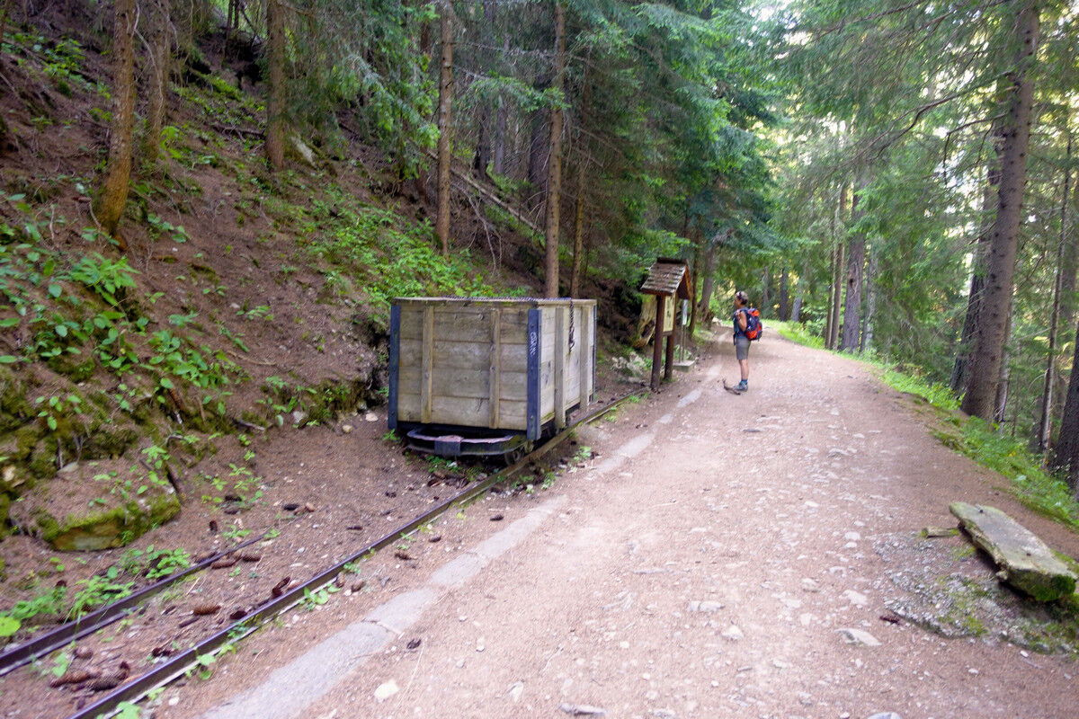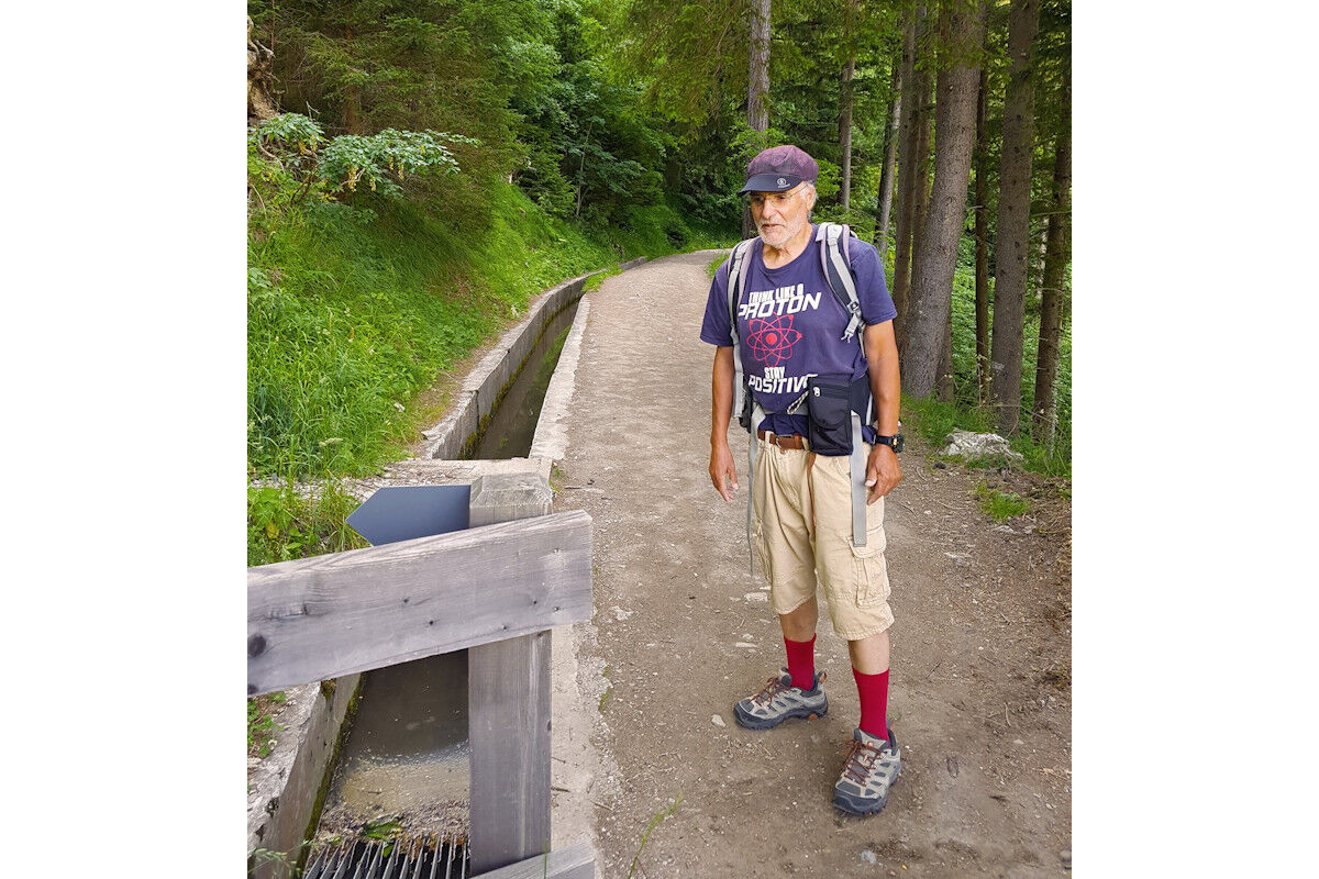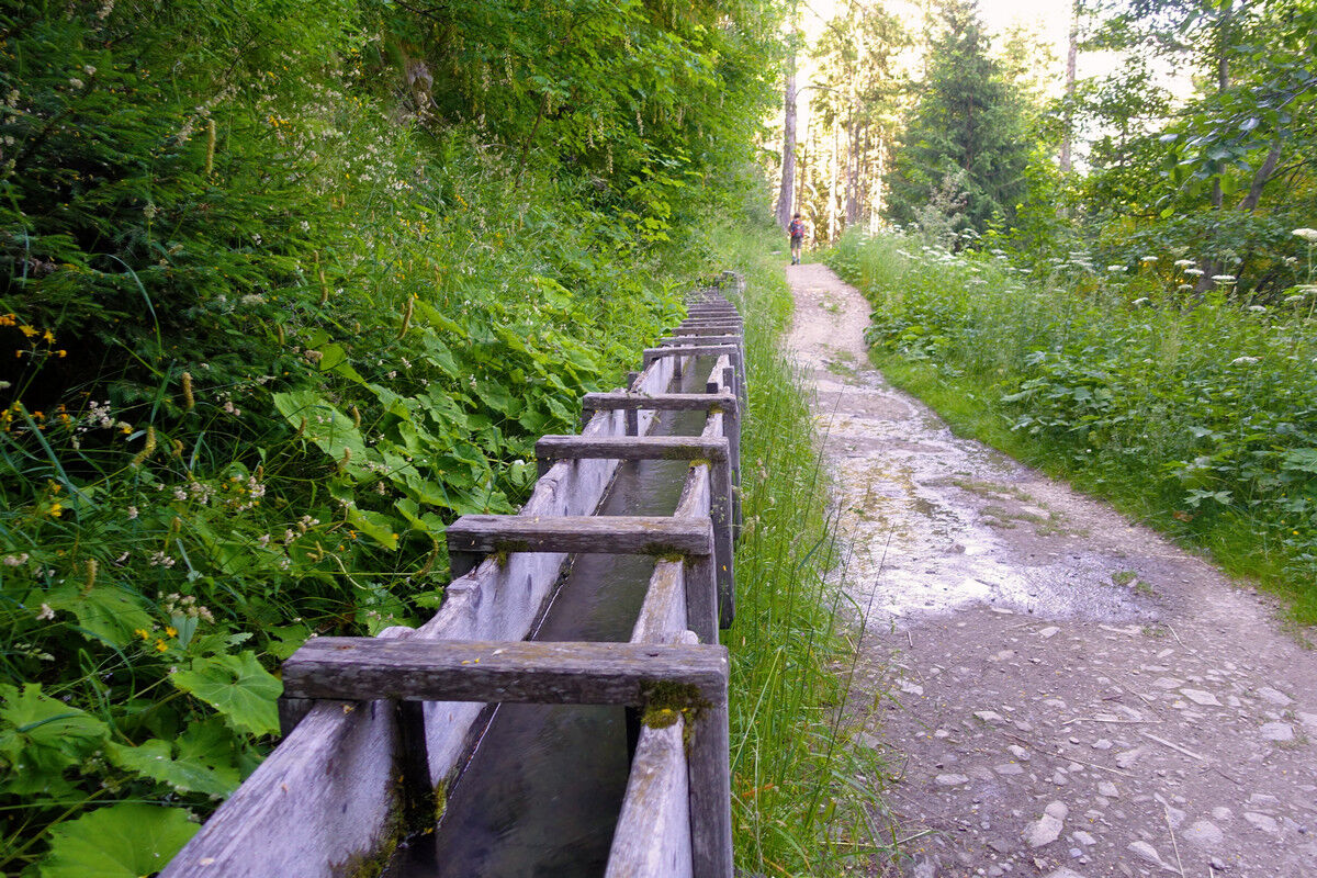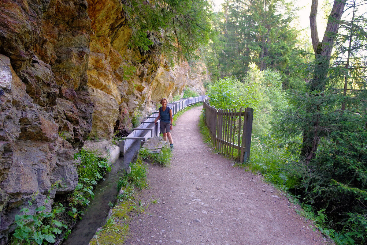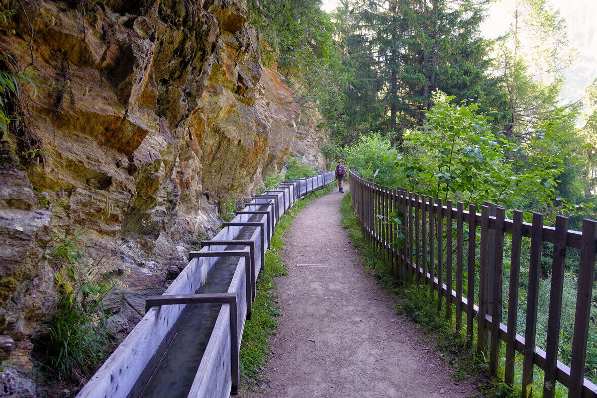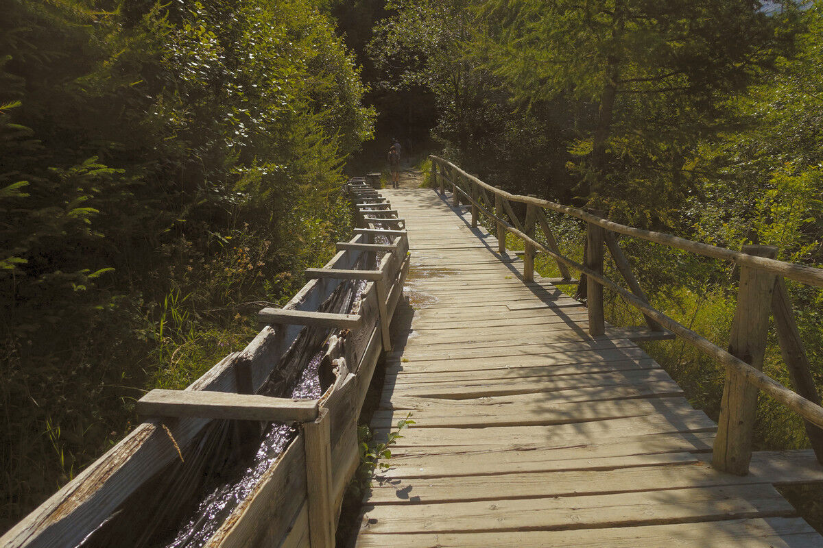 Immer wieder fließt die Bisse in Holzbännen. Dies soll unter anderem den Wasserverlust verringern. Unterwegs treffen wir auf einen Meldehammer, der von einem Wasserrad angetrieben wird und deshalb regelmässig schlägt. Wenn diese Schläge aufhören, weiß der Bissenwächter, dass kein Wasser mehr fließt und die Bisse somit beschädigt sein muss. Heute ist der Hammer leider angekettet und muss schweigen.