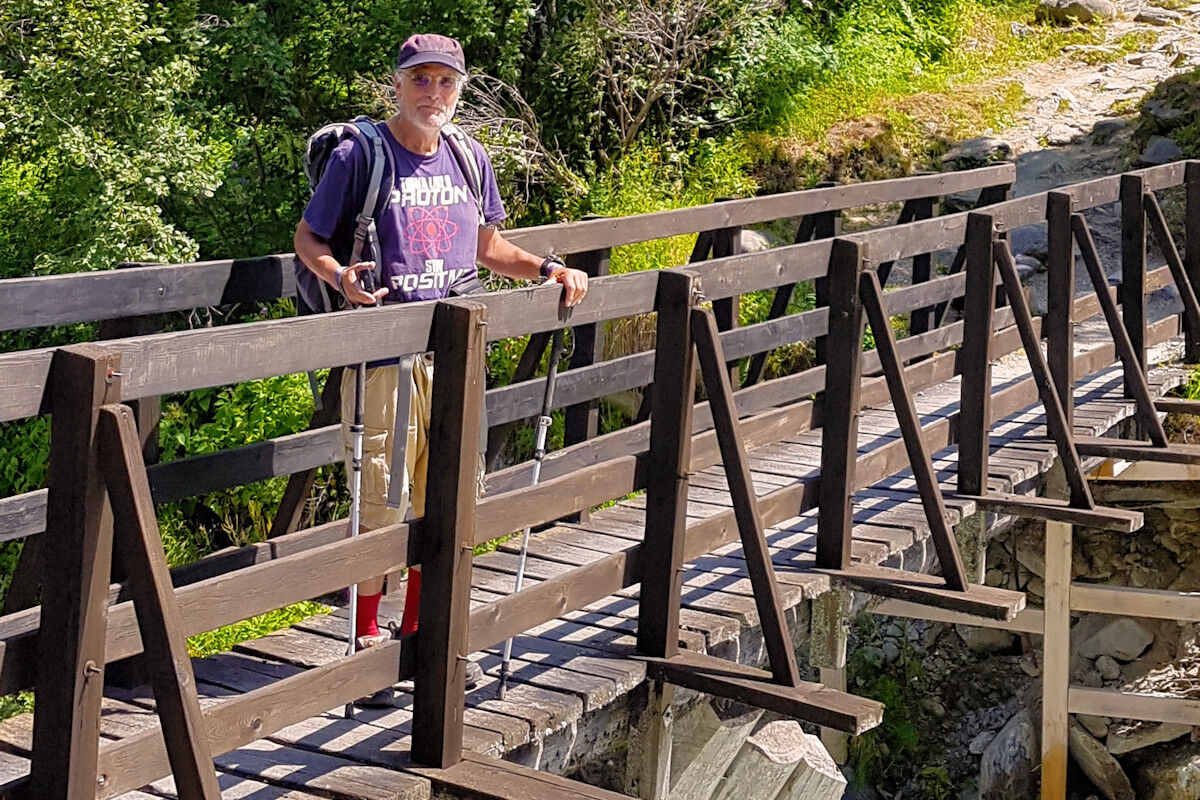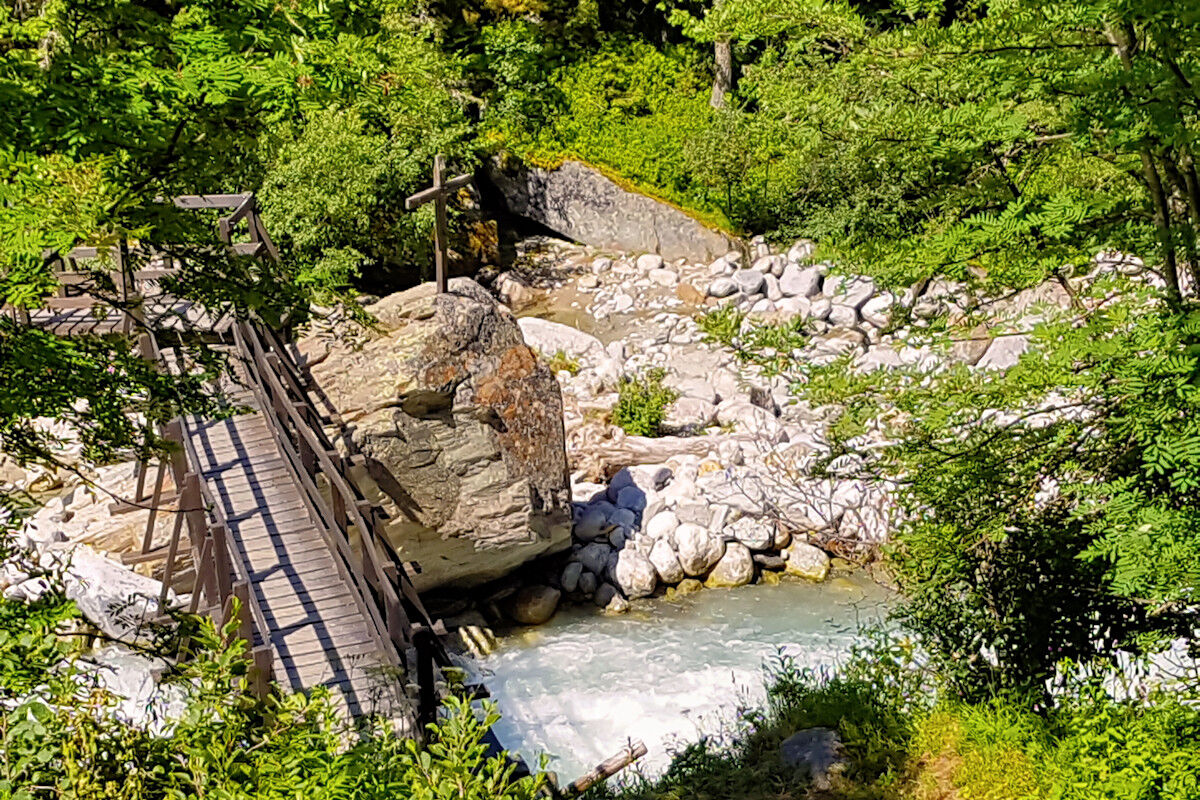 Um nicht den gleichen Weg zurückgehen zu müssen, könnten wir beim Châlet zum Trient-Bach hinunter steigen, eine Brücke überqueren und auf einem kleinen Strässchen ins Tal hinuntergehen. Leider ist der Weg kurz nach der Brücke gesperrt, so dürfen wir auf dem Suonenweg zurück zum Col de la Forclaz.