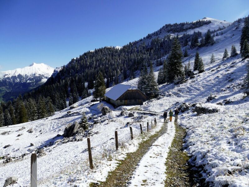 Ausgeruht und vom Frühstück gestärkt fahren wir mit dem Schmiedsboden-Bähnli aufwärts. Ein kurzer Aufstieg auf einem schmalen, rutschigen Pfad und ein anschließender Höhenweg bringt uns zur Alp Brändeln. Die Brändlen-Bahn fährt uns runter nach Wolfenschiessen. Durch den Ort wandern wir an das Ufer der Engelberger Aa und dem Fluss entlang zur Talstation der Diegisbalm-Bahn. Von der Bergstation führt ein teils schmaler, matschiger Pfad den Hang entlang zur Alp Büelen. Das letzte Buiräbähnli, die Büelenbahn bringt uns wieder hinab an das Ufer der Engelberger Aa. Vorbei am barocken Herrenhaus Grafenort wandern wir das letzte Stück im Talboden der Engelberger Aa entlang zurück zum Ausgangspunkt in Mettlen-Grafenort.
