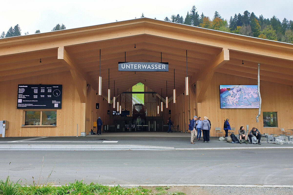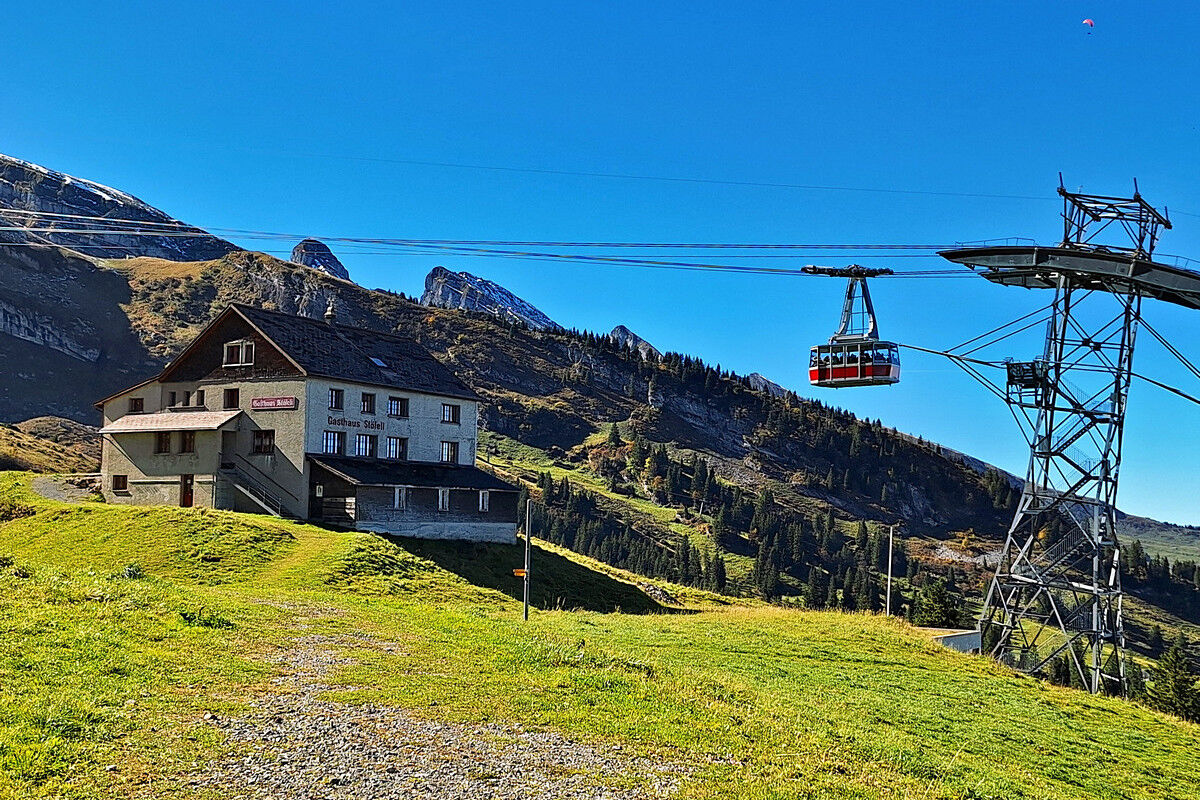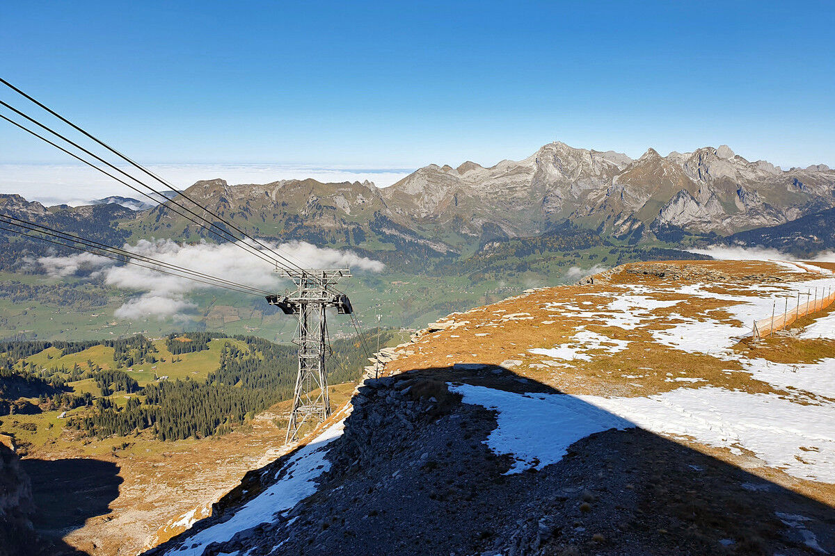 Am Bahnhof der Iltios-Standseilbahn in Unterwasser beginnt unser Tag. Die Sonne scheint, der Himmel ist blau, perfektes Wanderwetter. Wir nehmen die Standseilbahn hinauf nach Iltios und überwinden so bequem die ersten 400 Höhenmeter. Schon während der Auffahrt genießen wir den Blick über das Tal. Die Bahn surrt leise, das Dorf liegt bald unter uns. Oben angekommen empfängt uns frische Bergluft und ein Panorama, das nach Norden den Alpstein mit Säntis und nach Süden die markanten Zacken der Churfirsten zeigt. Über dem Rheintal liegt noch die Nebeldecke.