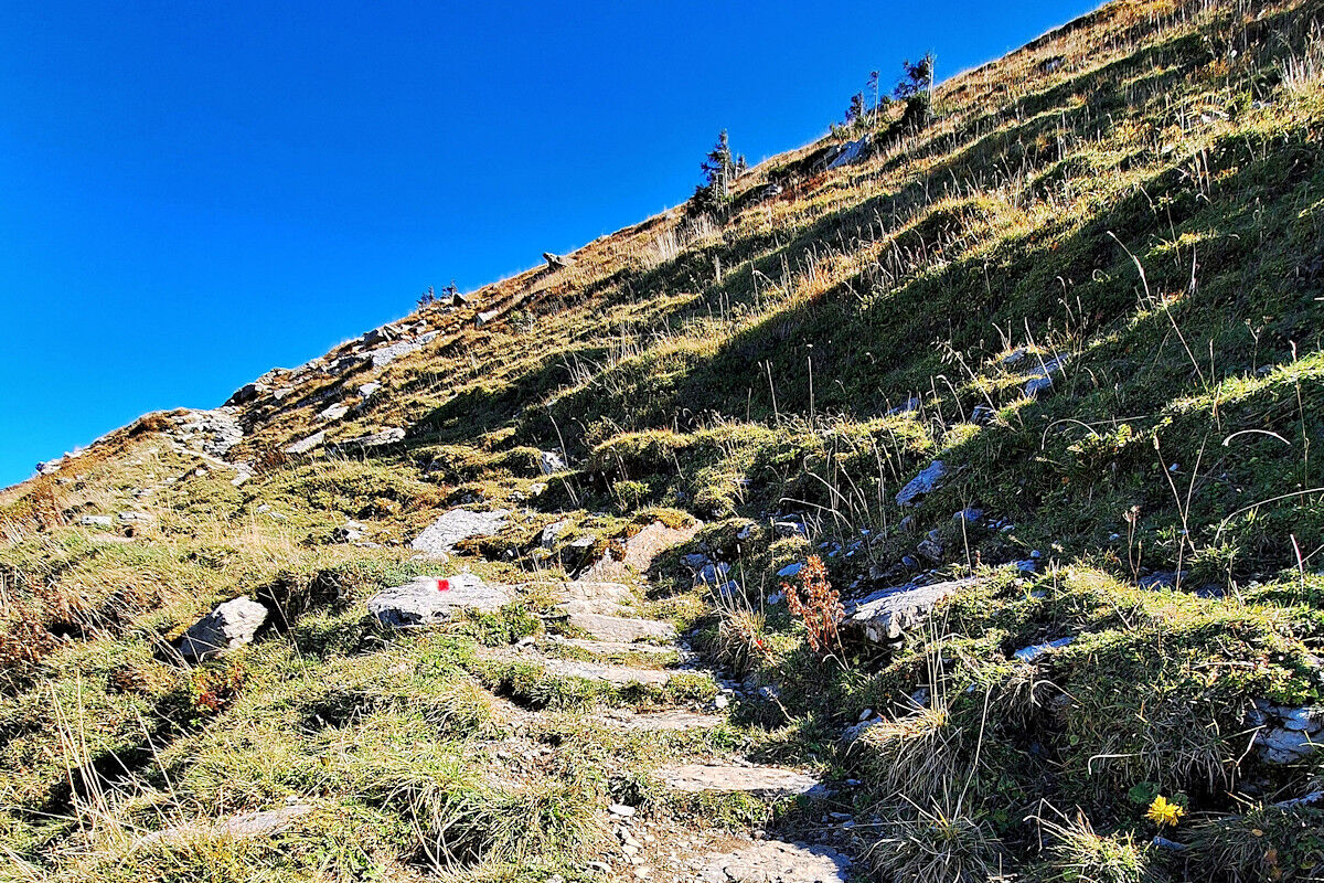 Der letzte Anstieg ist ein schmaler Bergpfad, steil, steinig, aber gut begehbar. Treppenartige Steinformationen und ein paar gut ausgebaute Queren führen durch die seltenen Zwergstrauchheiden. Nach diesem anstrengendsten Teil erreichen wir den breiten, sanft ansteigenden Rücken des Chäserrugg.