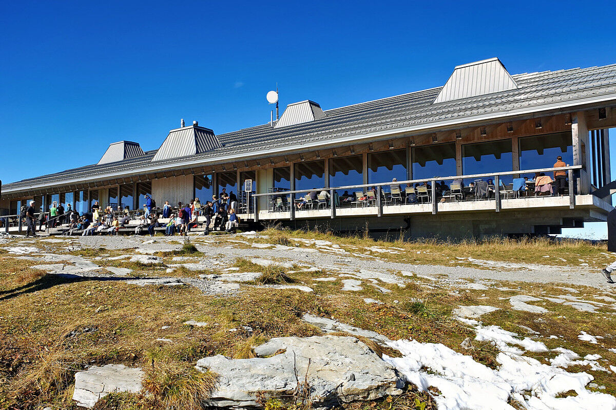 Der Weg schlängelt sich weiter über den Rücken, leicht ansteigend. Bald schon ist das Ziel in Sicht und das Gipfelgebäude mit Seilbahnstation und Bergrestaurant ergänzt die Aussicht.