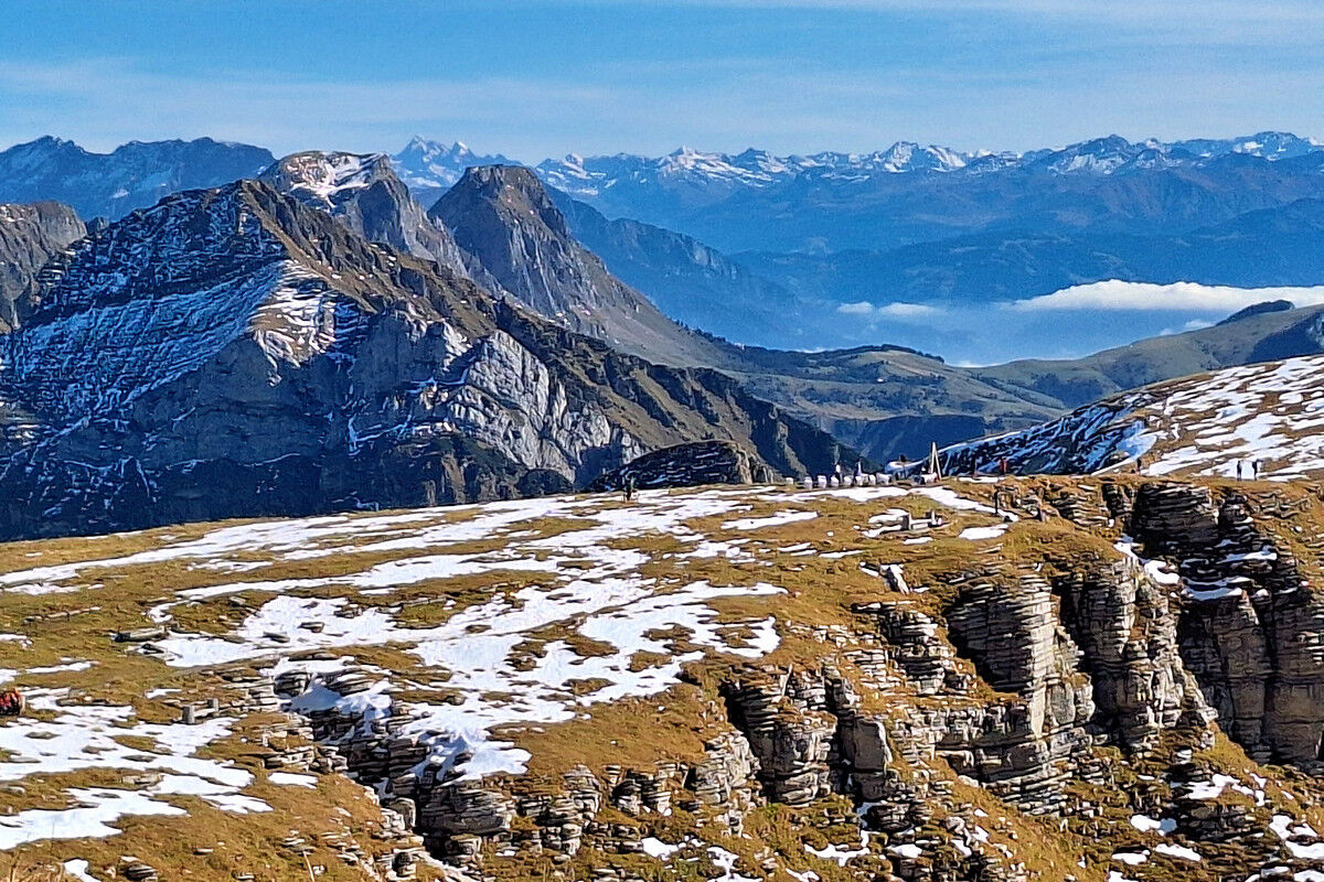 Hier erwartet uns ein atemberaubender Rundblick. Im Osten ahnen wir das nebelverhüllte Rheintal, sehen darüber die österreichischen Alpen, unter uns liegt der Walensee, darüber erstrecken sich die Glarner Alpen, im Norden ragt der schroffe Alpstein auf mit dem majestätischen Säntis. Auf der Terrasse des Gipfelgebäudes genießen die Menschen ihre Rast, im Wind fliegen die Dohlen hin und her. Wir setzen uns auf Felssteine am Rand der Gipfelebene und lassen den Blick über die Weite schweifen – Sonne, Ruhe, endlose Weite.