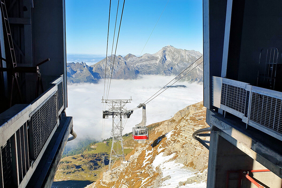 Für den Abstieg nutzen wir die Seilbahn vom Chäserrugg zurück nach Iltios. Dabei tauchen wir in den Nebel ein, der von unten hochgezogen ist. Die Sicht verschwindet, und wir spüren nur noch die feuchte, kühle Luft. In Iltios angekommen ist die Sicht gleich Null.