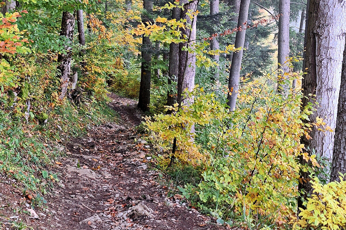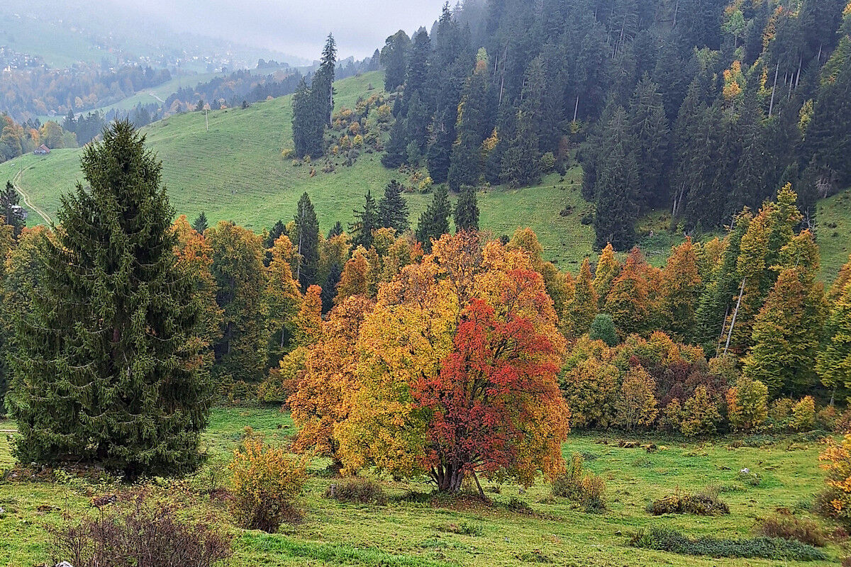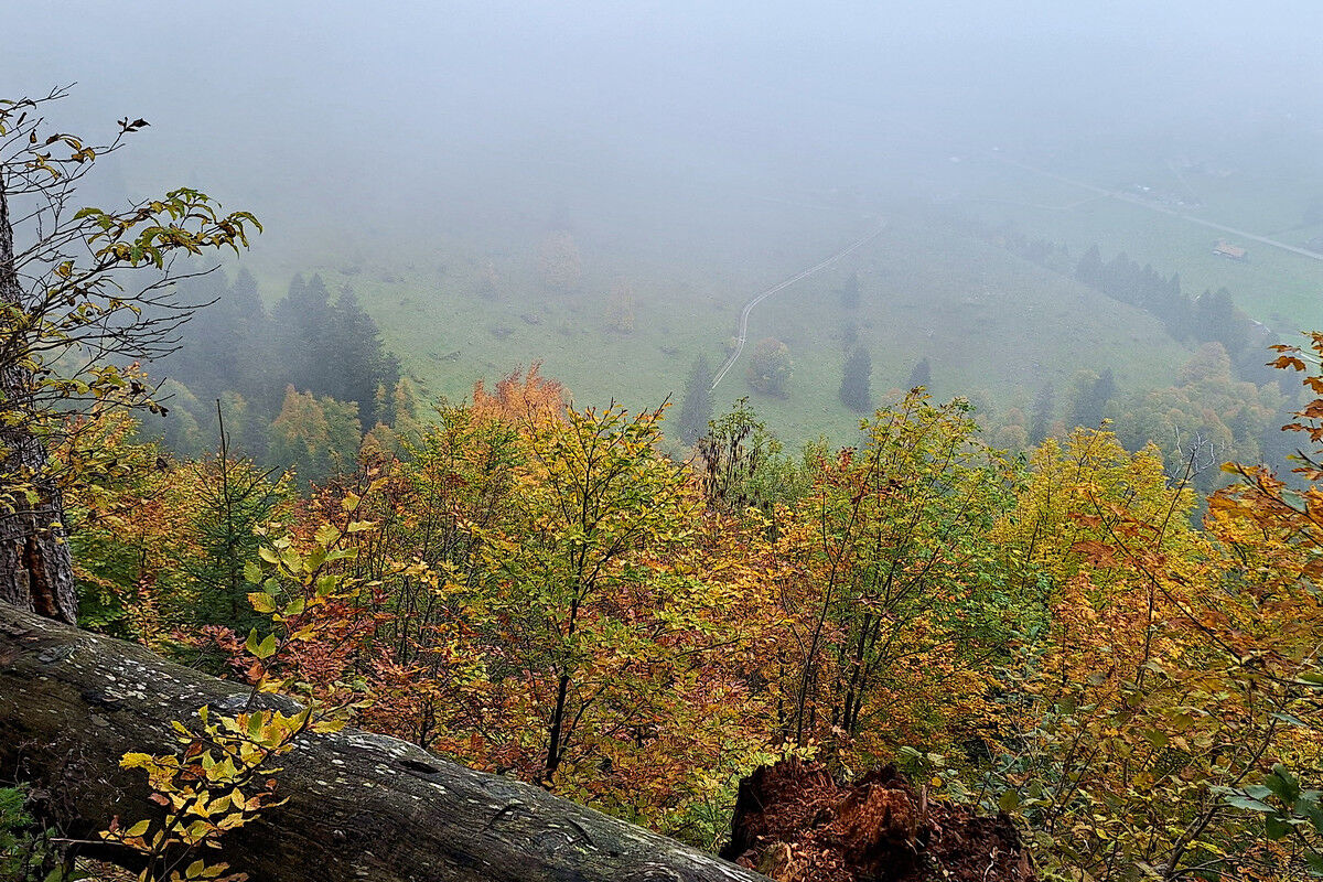 Von Iltios laufen wir über den Burenwald-Steinstoss-Weg hinunter nach Unterwasser. Auch hier bleibt der Nebel dicht, aber die Farben des Herbstwaldes – orange, rot und gold – machen den Abstieg zu einem besonderen Erlebnis. Unten in Unterwasser klart es wieder auf, es liegt nur noch der dichte Hochnebel über dem Tal. Ein stimmungsvolles Ende unserer Wanderung.