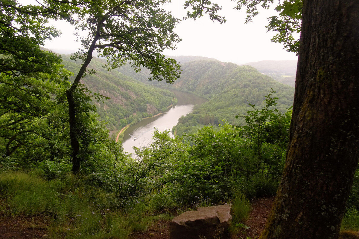 Trotz trübem Wetter machen wir uns nach dem Baumwipfelpfad auf den Cloefpfad. Auf breitem Weg wandern wir langsam bergab und erreichen den Aussichtspunkt Cloef. Auch hier erleben wir bei Nieselwetter eine fast schon gespenstischen Blick auf die Saarschleife. Gegenüber erkennen wir die auf der Spitze des von der Saar umflossenen Bergsporns liegende Burgruine Montclair.