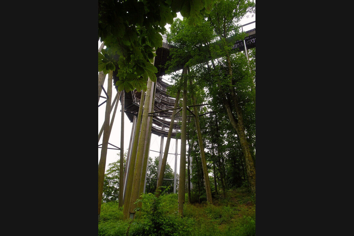 Leider ist der Himmel grau, aber es ist (noch) trocken. So machen wir uns guten Mutes auf zur Parkanlage beim Cloefatrium mit Informationszentrum und zum Eingang des Baumwipfelpfades. Mit einer Gesamtlänge von 1.250 Metern und einer Höhe von 3 bis 23 Metern schlängelt sich der Baumwipfelpfad durch Buchen, Eichen und Douglasien in Richtung Saarschleife – vorbei an zahlreichen Lern- und Erlebnisstationen.