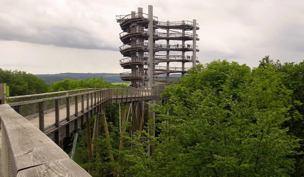 Leider ist der Himmel grau, aber es ist (noch) trocken. So machen wir uns guten Mutes auf zur Parkanlage beim Cloefatrium mit Informationszentrum und zum Eingang des Baumwipfelpfades. Mit einer Gesamtlänge von 1.250 Metern und einer Höhe von 3 bis 23 Metern schlängelt sich der Baumwipfelpfad durch Buchen, Eichen und Douglasien in Richtung Saarschleife – vorbei an zahlreichen Lern- und Erlebnisstationen.