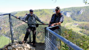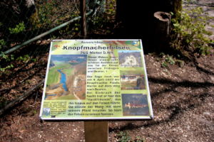 Vom großen Parkplatz vor dem Berghaus Knopfmacher führt ein geländergesicherter Pfad leicht abwärts zum Knopfmacherfelsen mit einer herrlichen Aussichtskanzel und Infotafel zur Knopfmacher-Sage. Links in der Ferne sehen wir das Kloster Beuron, gegenüber winkt Schloss Bronnen und untem im Tal liegt direkt an der Donau das Jägerhaus.