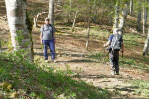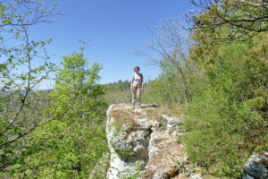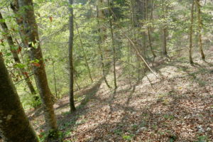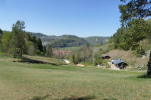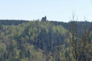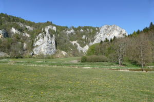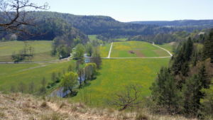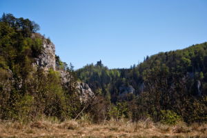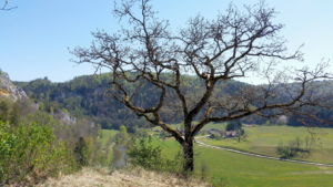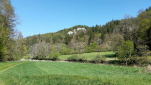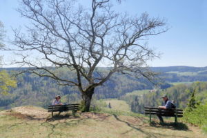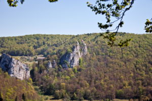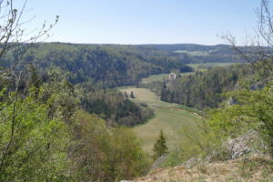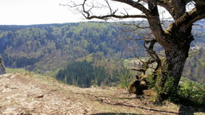 Über eine lichte Wiese, links über dem Tal ist die Ruine Kallenberg zu sehen, geht es wieder in den Wald und nun permanent bergab. Meist an der Hangkante entlang wandern wir bis zum Laibfelsen, ebenfalls ein fantastischer Aussichtspunkt.
