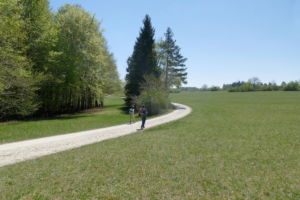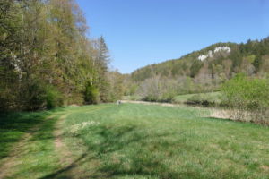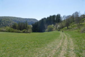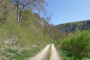 Nun führt ein schmaler Pfad abwärts, zunächst durch den Wald, dann am Waldrand entlang und wieder in offenes Wiesengelände. Am Hertlekreuz, einem Steinkreuz am Wegesrand mit schöner Aussicht vorbei geht es weiter abwärts, bis wir linkshaltend, nach einer steileren Passage, die Talsohle mit der Donau erreichen.
