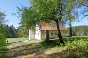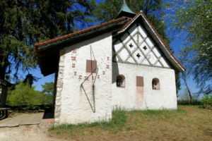 Zurück beim Berghaus folgen wir bei einer Wanderweg-Infotafel der Beschilderung Richtung Stiegelesfels-Laibfels. Das Berghaus zur Linken gehen wir auf guten, breiten Wegen, geleitet vom Donauwellensymbol. Bald erreichen wir den nächsten Aussichtspunkt, den Stiegelesfelsen. Rechtshaltend weiter an der Hangkante entlang passieren wir nochmals eine Aussichtsstelle mit Bank und Blick ins Donautal hinab, und kurz darauf stoßen wir auf eine kleine Kapelle mit großer Sonnenuhr.