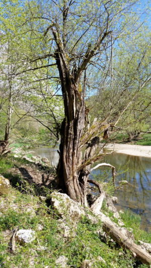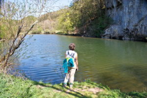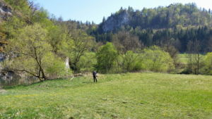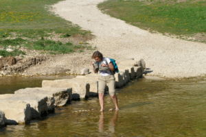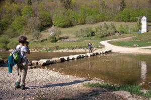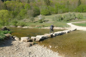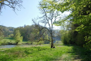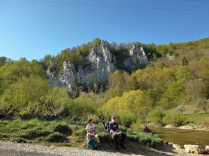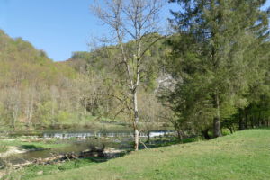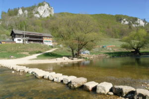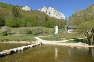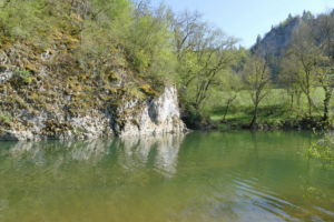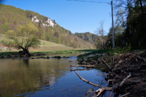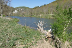 Hier zweigt links in den Wald ein schmaler, steiler, kaum sichtbarer Pfad ab, der uns auf den Felsen führt. Nach dem Felsen geht es weniger steil wieder hinab ins Tal und bald erreichen wir auf einem Wiesenweg das Jägerhaus. Dieses liegt aber auf der anderen Donauseite, und eine Brücke gibt es hier nicht mehr. Über Stepping Stones kann man hinüber, was wir auch ausgiebig mit viel Spass tun. Bei Hochwasser wäre das nicht zu empfehlen.