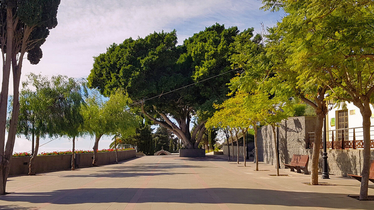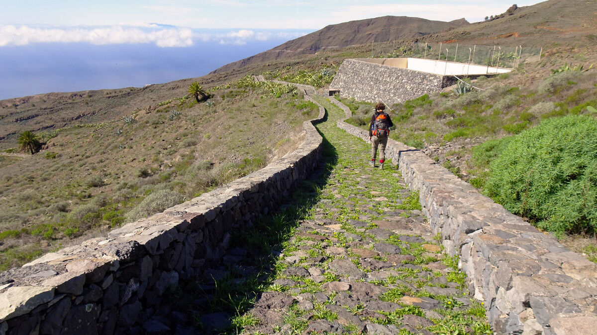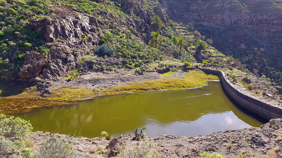 Diesem folgen wir, vorbei an einem kleinen Stausee. Danach geht der Camino leicht bergauf bis zu einer Straße, die uns geradeaus zum Parkplatz beim Rathaus und der Kirche im Zentrum von Alajeró führt.