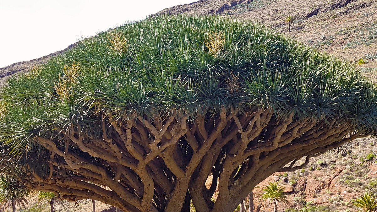 Botanisch gesehen ist der Drachenbaum kein Baum, sondern gehört zur Familie der Spargelgewächse (Asparagaceae). Der Stamm verzweigt sich nach der ersten Blüte im Alter von zehn bis zwölf Jahren und bildet Äste, die wie Wurzeln ein dichtes Geflecht bilden. Das Alter wird bestimmt, indem man die Anzahl der Verzweigungen der Äste zählt. Drachenbäume wachsen sehr langsam, unter optimalen Bedingungen alle 10 Jahre einen Meter. Dafür werden sie sehr alt: Der Drago de Agalán ist mit über 400 Jahren der älteste und größte Drachenbaum auf La Gomera.
