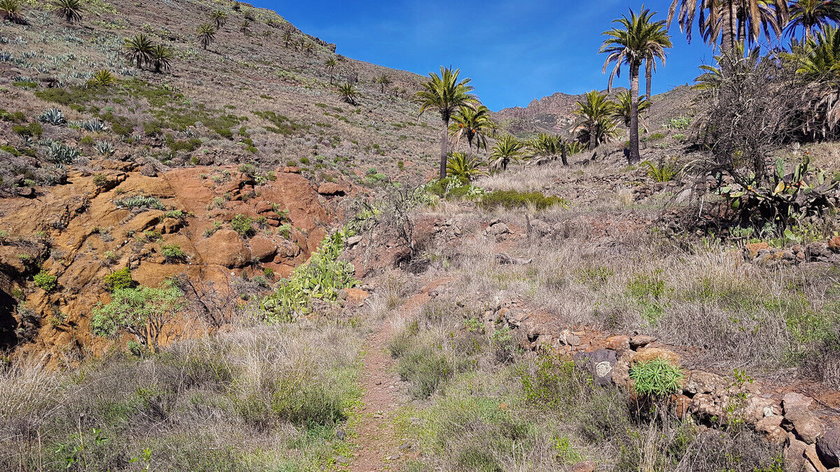 Von der Plattform aus führt ein Weg um den Drago herum über Terrassen zum Barrancorand und ein kurzes Stück an diesem entlang. Dann steigt er in den Barrancogrund ab. Durch diesen geht es weiter, meist weglos über Felsblöcke talwärts, bis der Weg an einer Felspartie mit kleinen Wassertümpeln in den querenden GR-132 mündet.