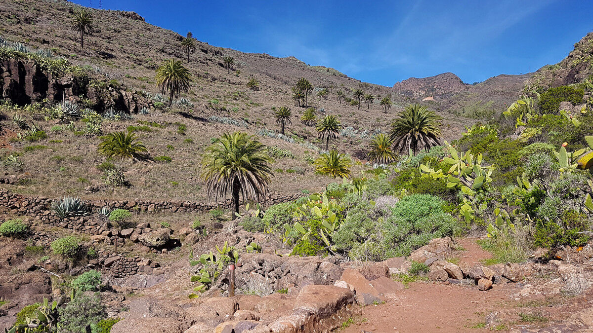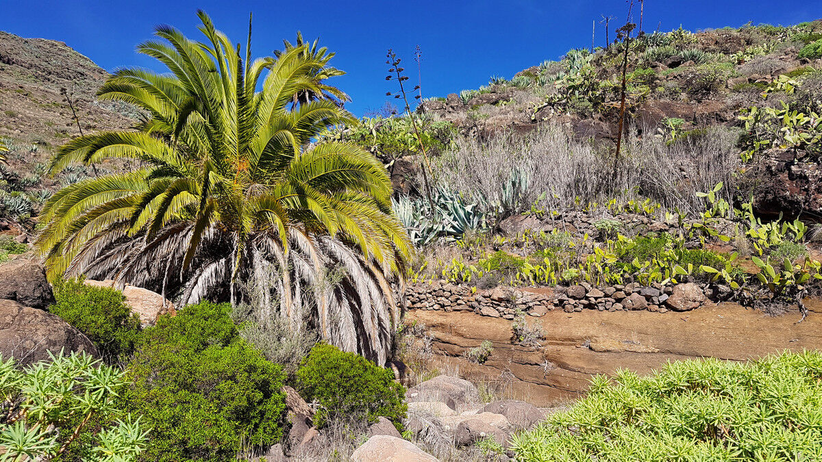Auf allen acht Kanarischen Inseln gibt es Drachenbäume von großer Bedeutung und Schönheit, auf La Gomera sind sie im Gegensatz zu Teneriffa und La Palma eine absolute botanische Rarität. Das älteste und größte Exemplar auf La Gomera hat sogar einen eigenen Namen: Drago de Agalán. Der stattliche Drago steht in einem malerischen, mit Feigenkakteen und Agaven bewachsenen Barranco bei Agalán, etwas oberhalb von Alajeró. Nach dem Besuch des Dragos steigen wir den Barranco weiter hinab und wählen den Rückweg über Alajeró, den Hauptort des Inselsüdens.