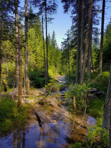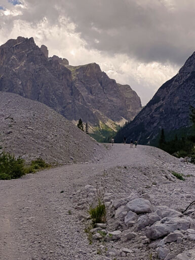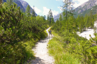 Schöner und vor allem ruhiger ist der Weg Nr. 105 (Dolomiten-Höhenweg 4), der bei der Alten Säge beginnt und entlang des Innerfeldbaches taleinwärts führt. Der Weg überquert den Bach mehrmals auf Brücken und auch die Straße wird zweimal überquert – und ist für Mountainbiker gesperrt.