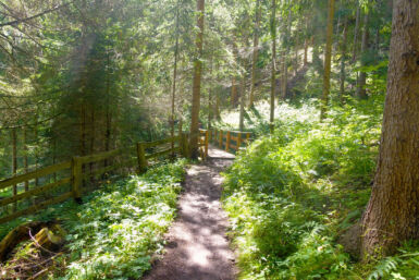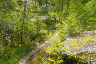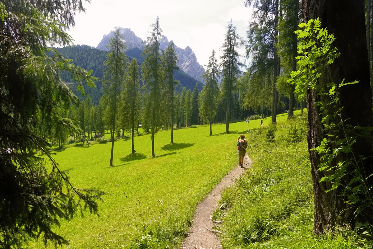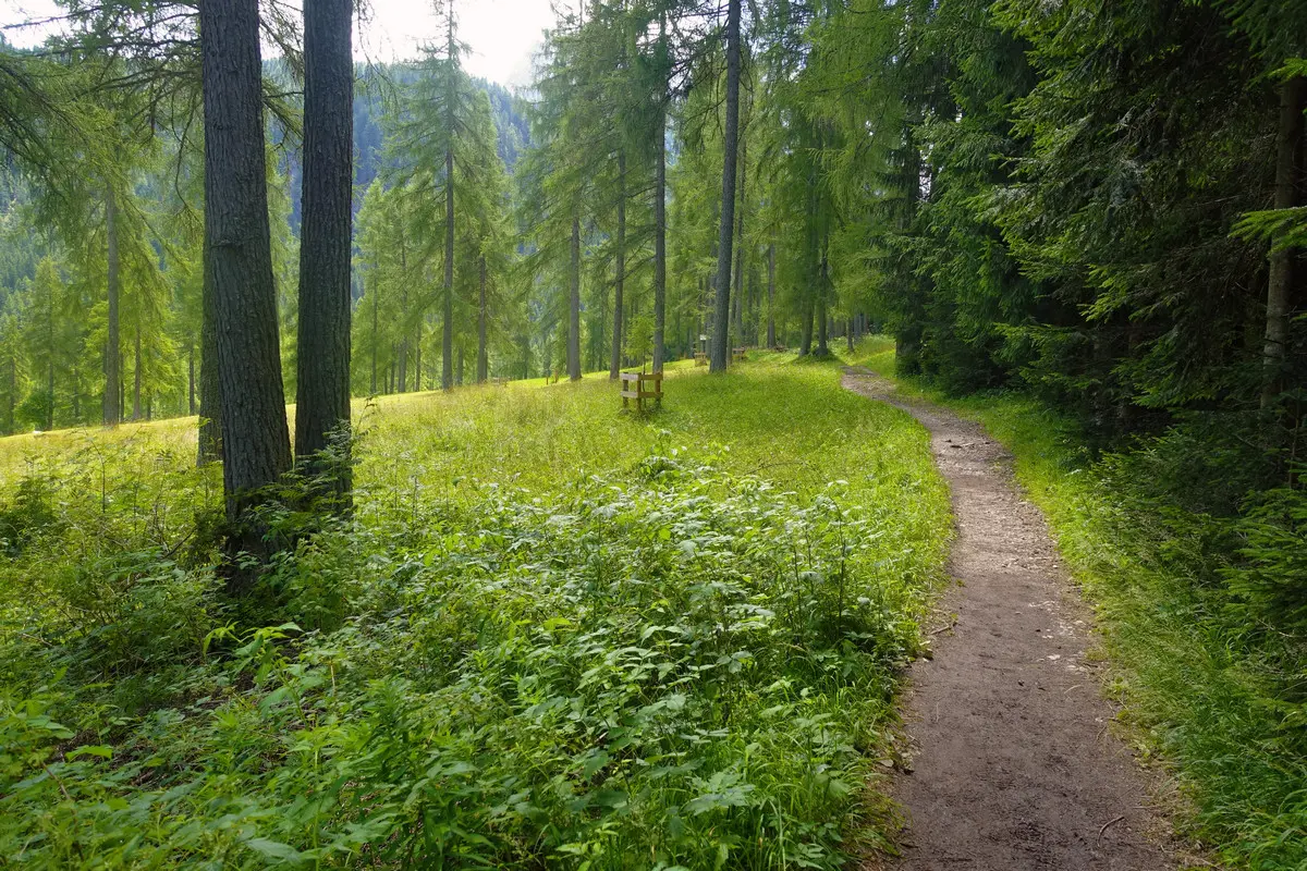 Auf einer nun wieder fast leeren Naturstraße geht es durch Nadelwald und Lärchenwiesen sanft bergab und zurück nach Sexten.