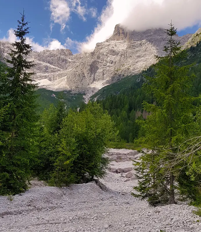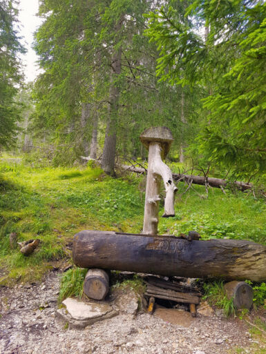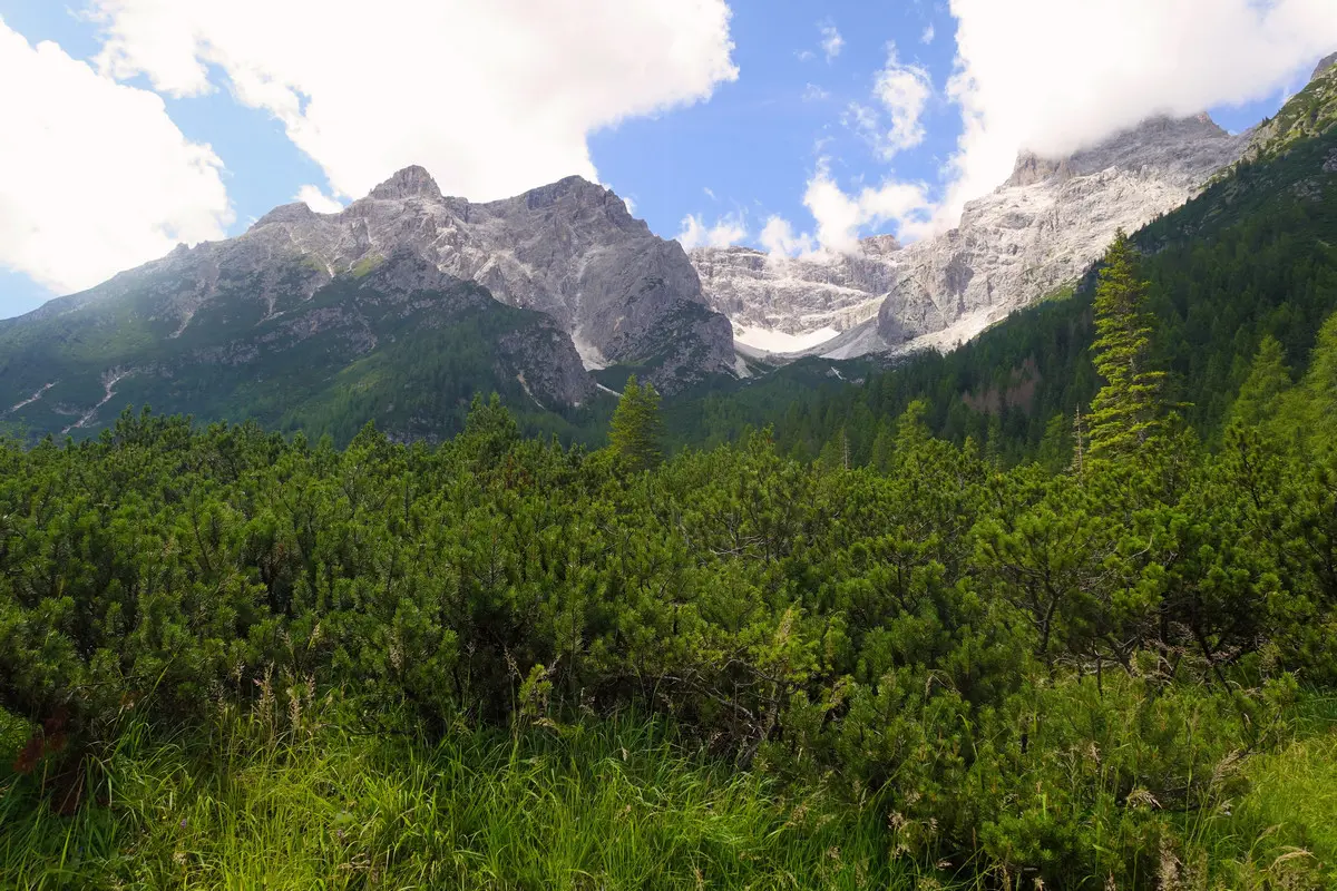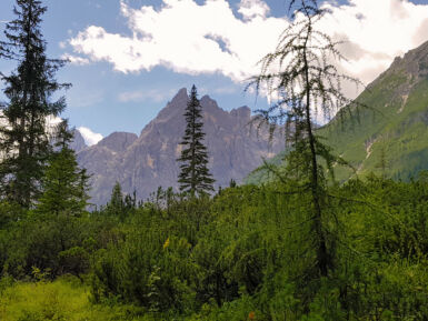 Dies ist keine Tour für Einsamkeitssuchende. Da aber die meisten Touristen und Wanderer bis zum Großparkplatz in der Mitte des Fischleintals fahren, sind wir zumindest auf dem Hinweg zum Fischleinboden fast allein. Vorbei am zerstörten Fort Haideck führt ein schöner Wald- und Panoramaweg zu den Lärchenwiesen des äußeren Fischleintals. Zuletzt wandern wir durch Latschen zum Fischleinboden.