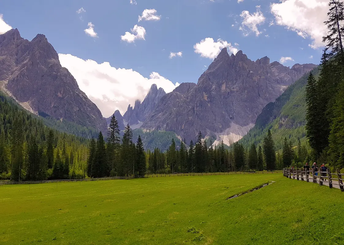 Das Fischleintal (ital. Val Fiscalina) in Sexten ist zwar nur 4,5 km lang, aber von einzigartiger landschaftlicher Schönheit. Am Eingang ins Fischleintal liegen idyllische Wiesen mit reichem Lärchenbestand. Dann führt uns das Tal, umgeben von Blumenwiesen, dichten Wäldern, urigen Almen und imposanten Felswänden der Dolomiten, durch den Naturpark 3 Zinnen zum Fischleinboden und hin zur Talschlusshütte. Dabei haben wir einen einzigartigen Blick auf die Sextner Sonnenuhr.