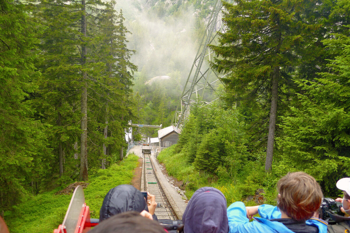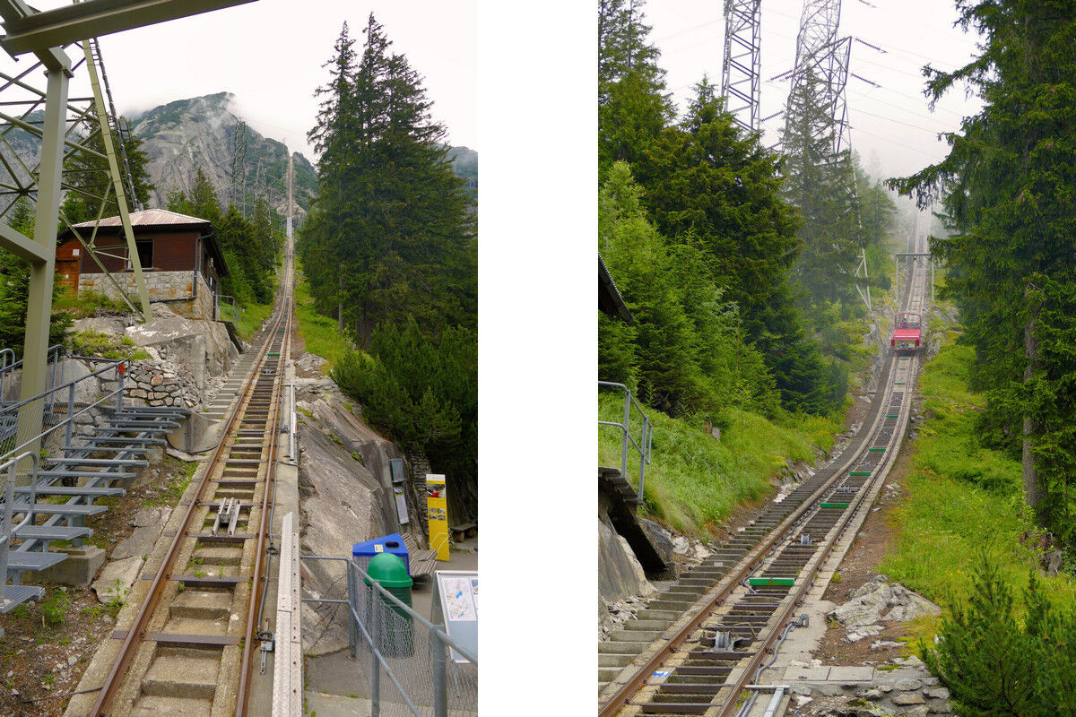 An der Talstation der Gelmerbahn lassen wir den Blick nach oben schweifen und stellen fest: heute ist der Tag der Mutproben. Auf einer Schneise im Gestein verlaufen Schienen fast senkrecht den Berg hoch. Mit 106 % Steigung ist die Gelmerbahn die steilste offene Standseilbahn Europas. Auf Holzbänken, nur mit einem Metallbügel gesichert, sitzen wir mit dem Blick Richtung Tal.